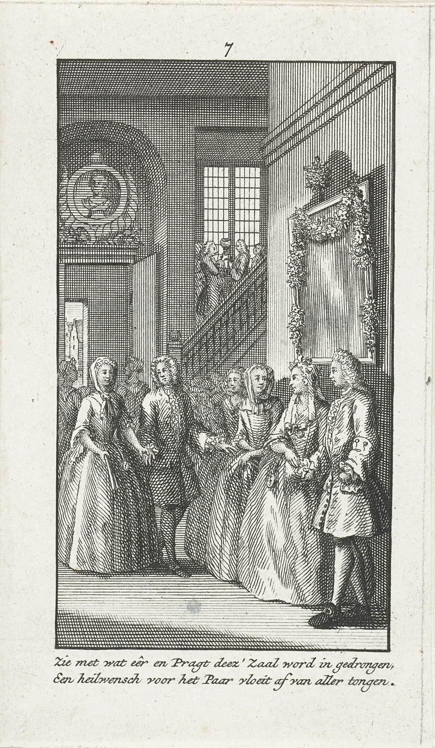 Huwelijksfeest met interieur van hal met jonge bruidspaar en hun gasten. Prent nr. 7 in een serie van twaalf prentjes met tweeregelige versjes over de Hollandse gewoontes bij het huwelijk ca. 1750.