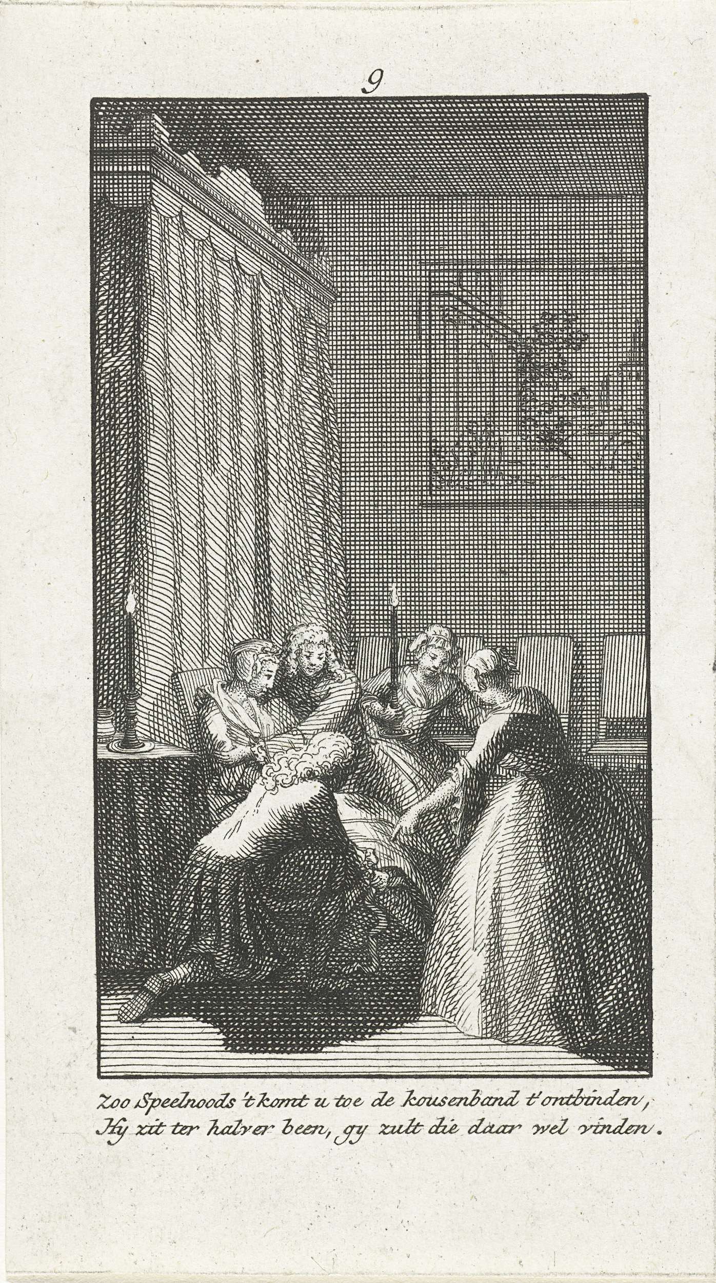 Interieur van slaapvertrek, vrouw op stoel gezeten, man op knieën ernaast ontbindt de kousenband onder haar rokken, drie vrouwen er omheen. Prent nr. 9 in een serie van twaalf prentjes met tweeregelige versjes over de Hollandse gewoontes bij het huwelijk ca. 1750.
