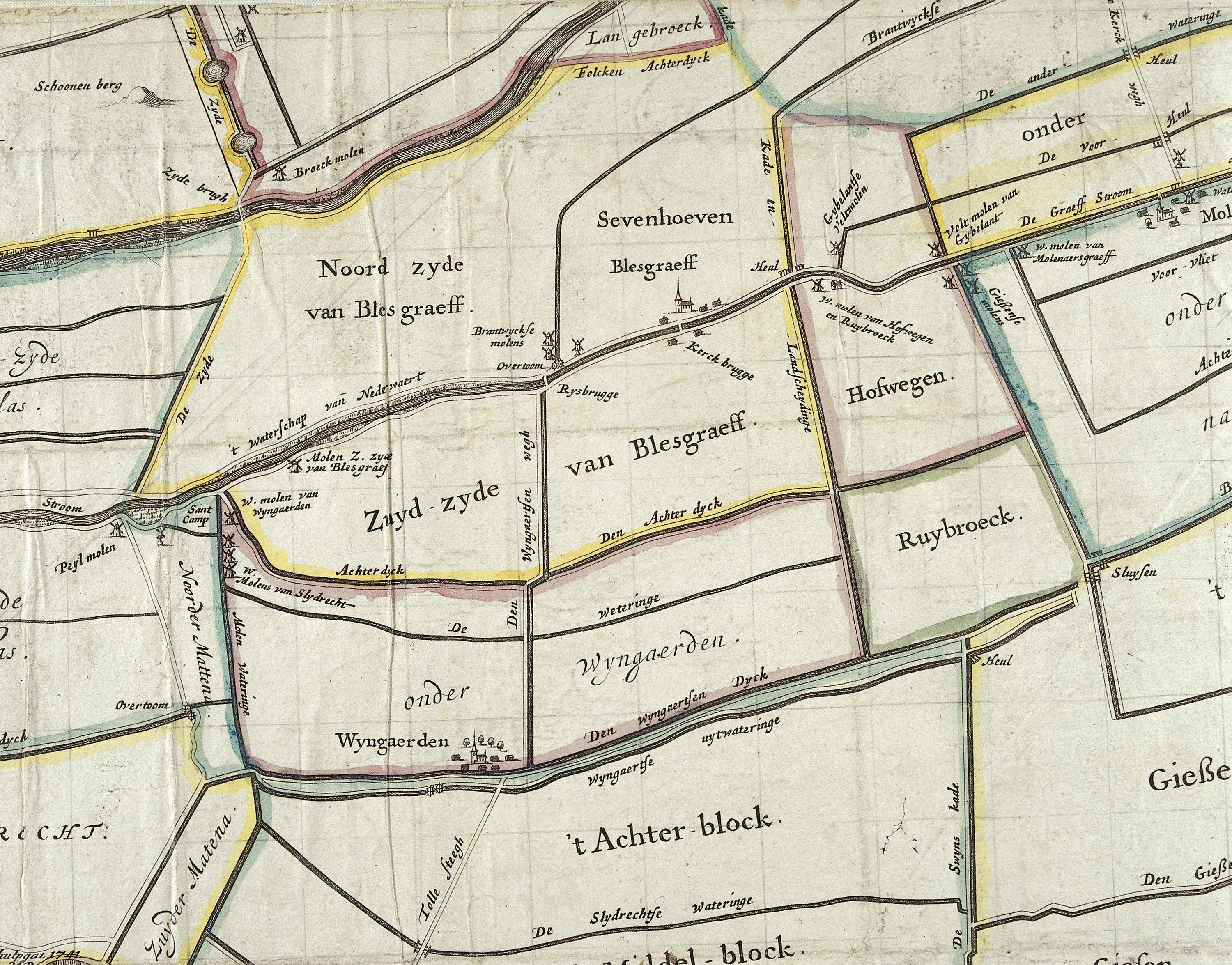 Kaart van het gebied ten noorden van de rivier De Merwede en ten westen van het Noorder Diep. Bij het samenkomen van deze rivieren: Dordrecht..