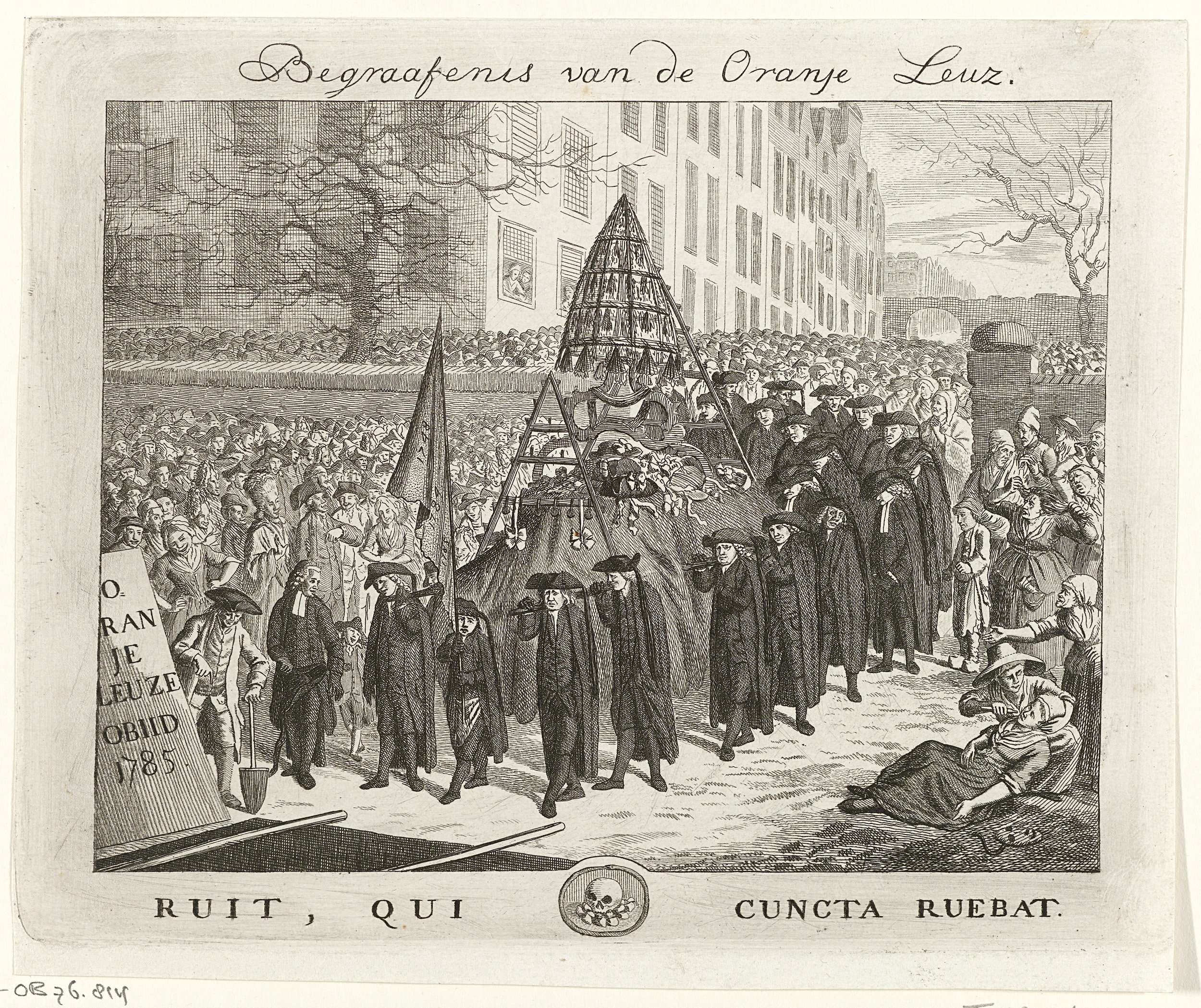Spotprent op de prinsgezinden bij het verbod door de Staten van Holland van 23 februari 1785 op het dragen van oranje. Begrafenisstoet waarin een grote schaar van rouwdragenden een baar met oranjelinten, strikken en illuminatiemateriaal, naar een geopend graf draagt, waarnaast een steen met opschrift: 'Oranje leuze Obiid 1785'. Onderaan een Latijns opschrift en een ...
