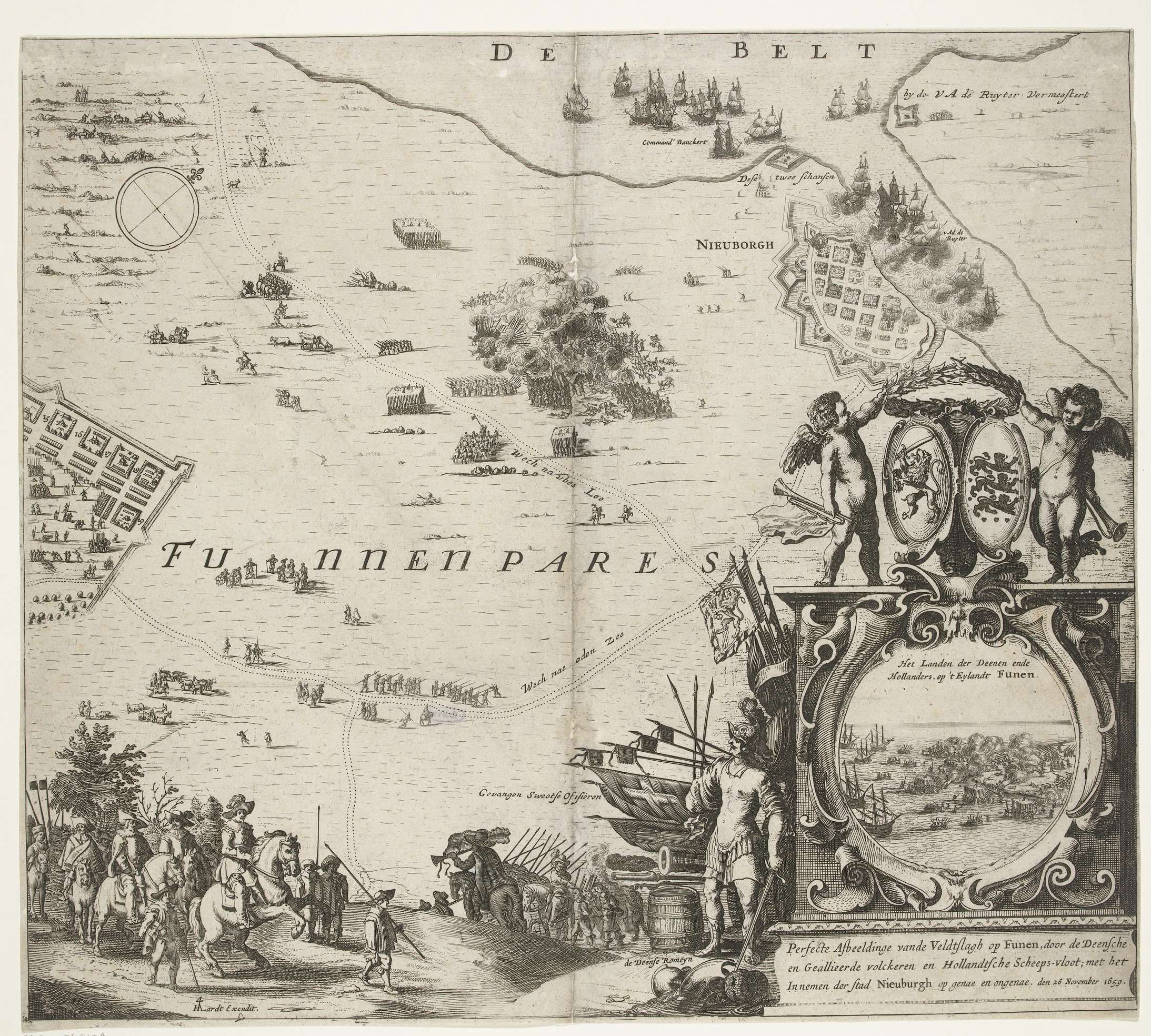 Inname van de stad Nyborg door Michiel Adriaenszoon de Ruyter en het verslaan van het Zweedse leger door de Denen, 25-26 november 1659. Kaart van het deel van het eiland Funen met een plattegrond van de stad met haven. Rechtsonder een grote cartouche met de landing van de Denen en de Hollanders op het eiland ...
