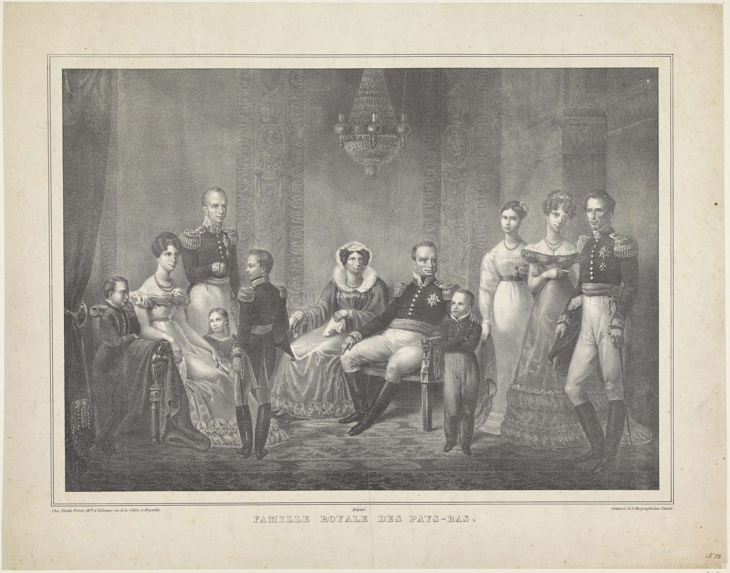 Familieportret van Willem I Frederik, Wilhelmina, hun zoon Willem II met echtgenote Anna Paulowna en vier kinderen, hun zoon Frederik met echtgenote Louise, en hun dochter Marianne. De groep bevindt zich in een salon. In de ondermarge een regel Franse tekst.