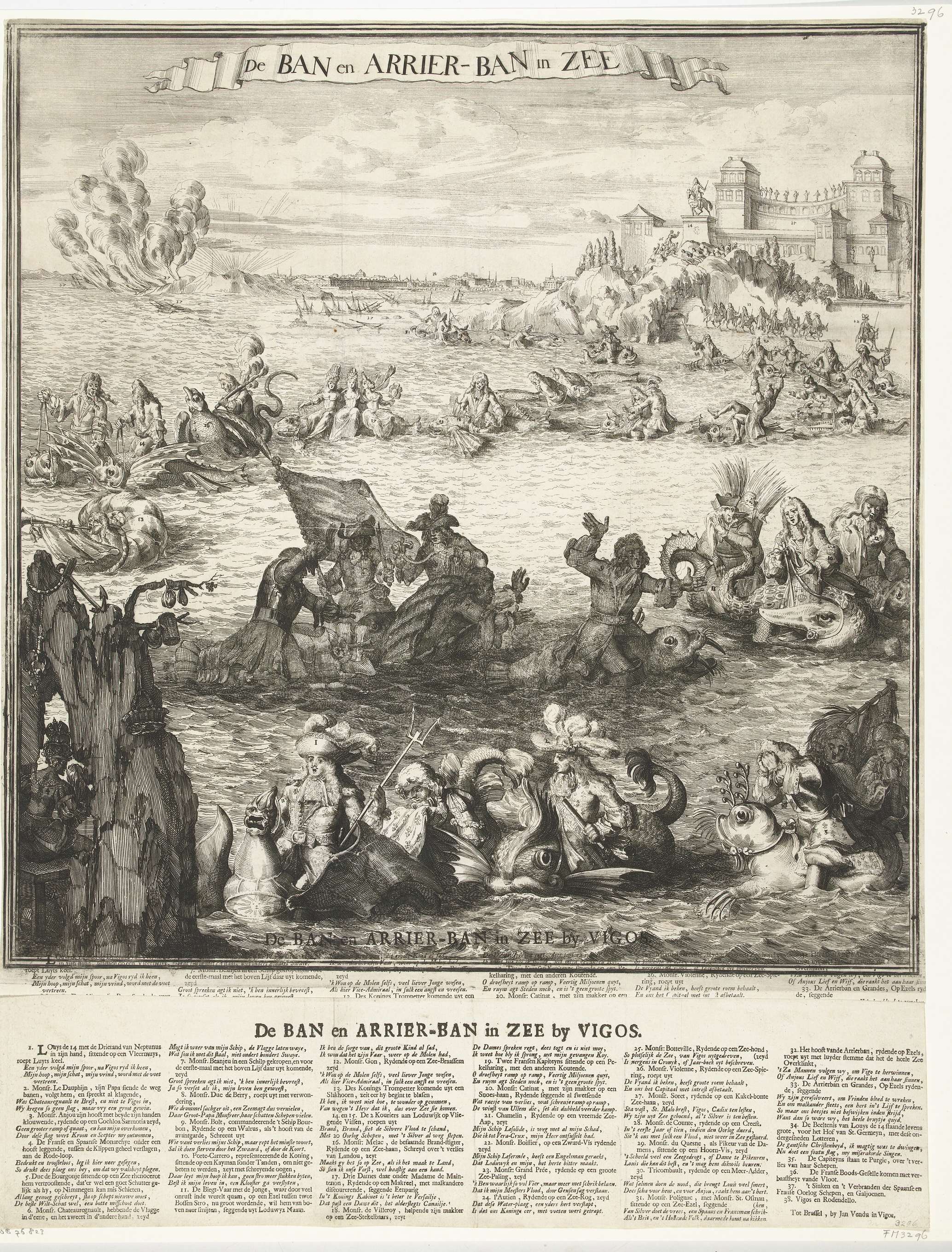 Spotprent op het nemen van de Spaanse zilvervloot op 23 oktober 1702. De zilvervloot lag onder bescherming van een vloot onder bevel van de Franse admiraal Chateaurenault bij Vigo voor de Spaanse kust. In het verschiet de baai van Vigo en de gezonken schepen, in het midden en op de voorgrond een lange ketting van ...