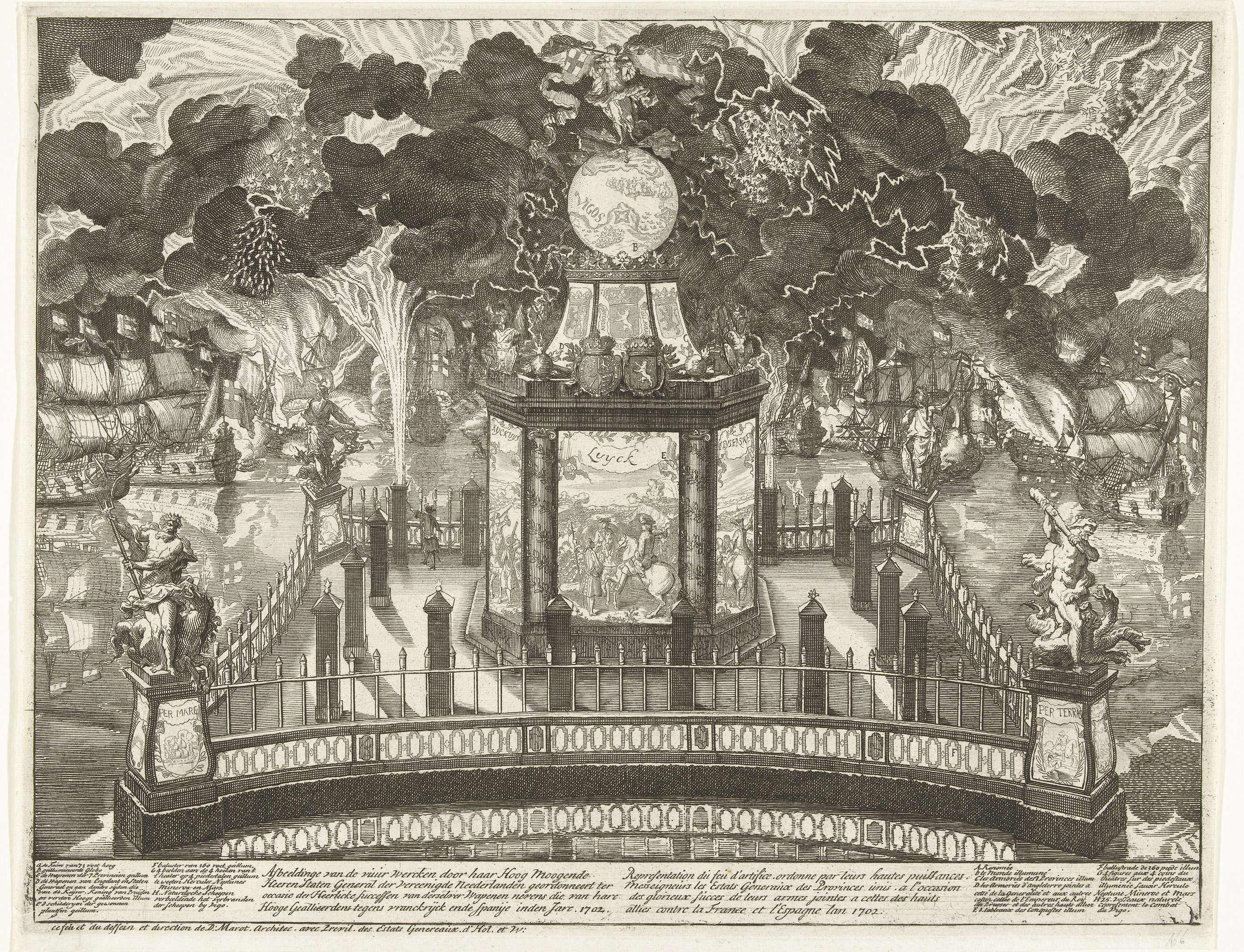 Vuurwerk ter viering van de overwinning bij Vigo, 1702. Uitvoerige afbeelding van het vuurwerk afgestoken op last van de Staten-Generaal op een stellage in de Hofvijver te Den Haag op 13 december 1702. In het midden van de vijver een stellage met een tempel van Mars versierd met acht voorstellingen van overwinningen van de geallieerden ...