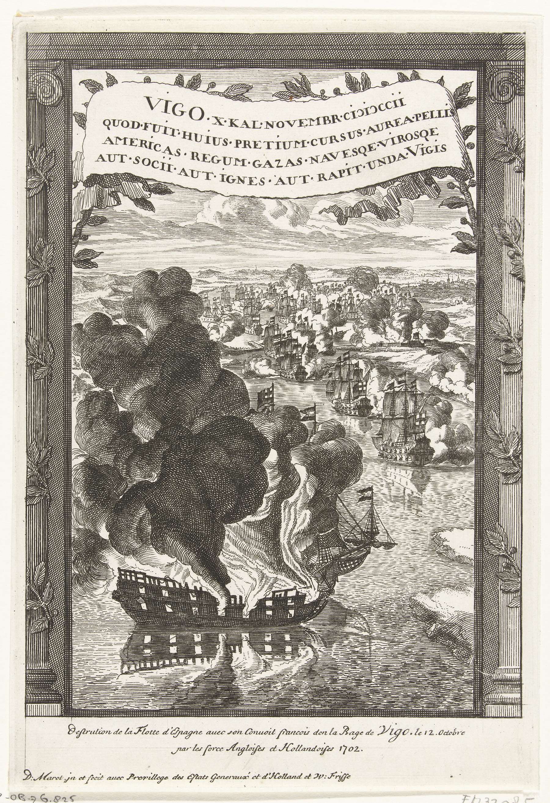 Paneel met een voorstelling van de overwinning van de gecombineerde Brits-Hollands vloot op de Spanjaarden en Fransen in de baai van Vigo, 23 oktober 1702. Onderdeel van de decoraties op de stellage met de Tempel van Mars tijdens het vuurwerk op de Hofvijver op 13 december 1702 te Den Haag. De Tempel van Mars was ...