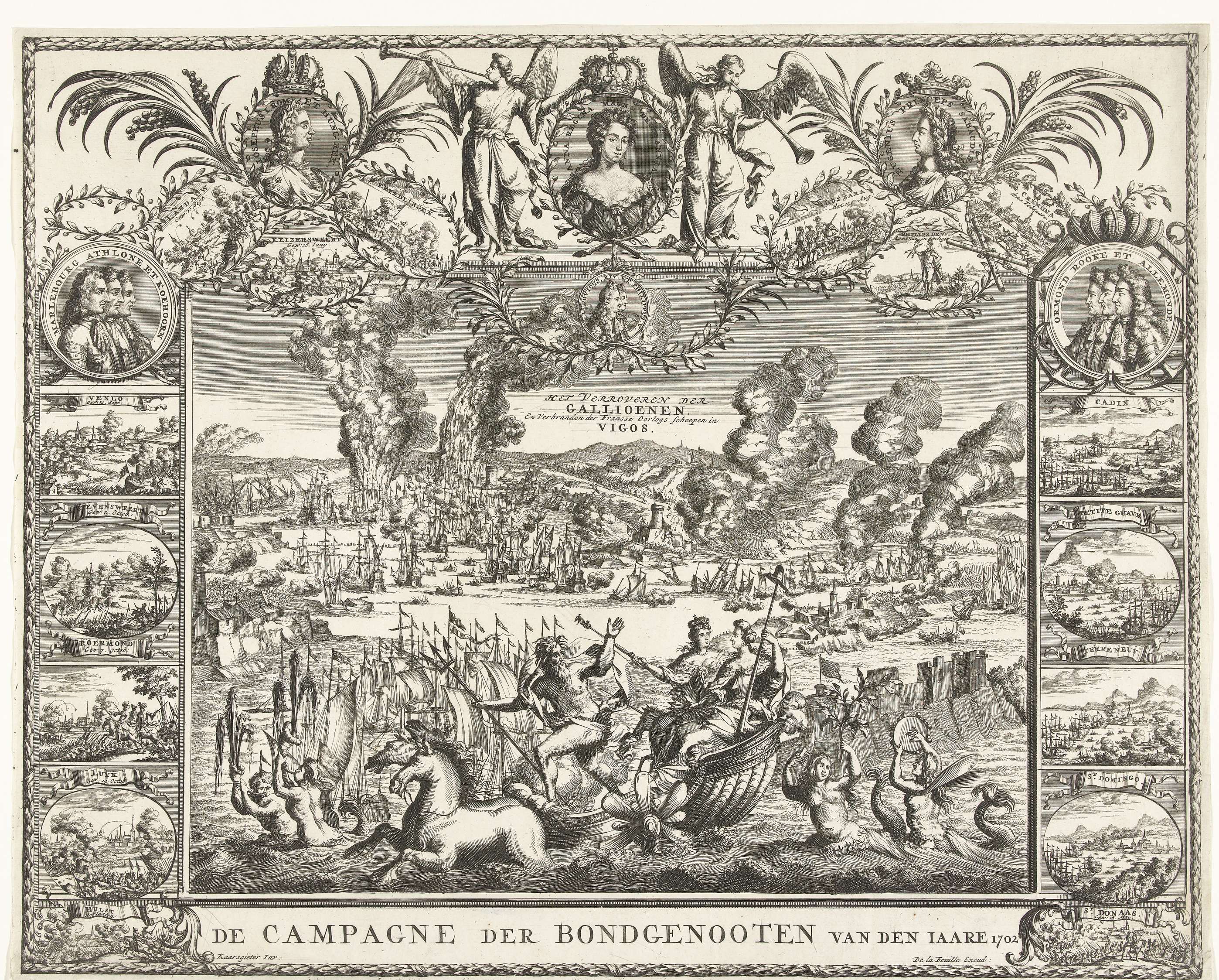 Allegorie op de overwinningen door de Geallieerden op de Fransen en Spanjaarden in het jaar 1702. Centraal de zeeslag bij Vigo met op voorgrond Neptunus op zeewagen met daarin twee vrouwen, omgeven door zeenimfen; op achtergrond zinken en verbranden der schepen in de overwinning in de zeeslag in de baai van Vigo op 23 oktober ...