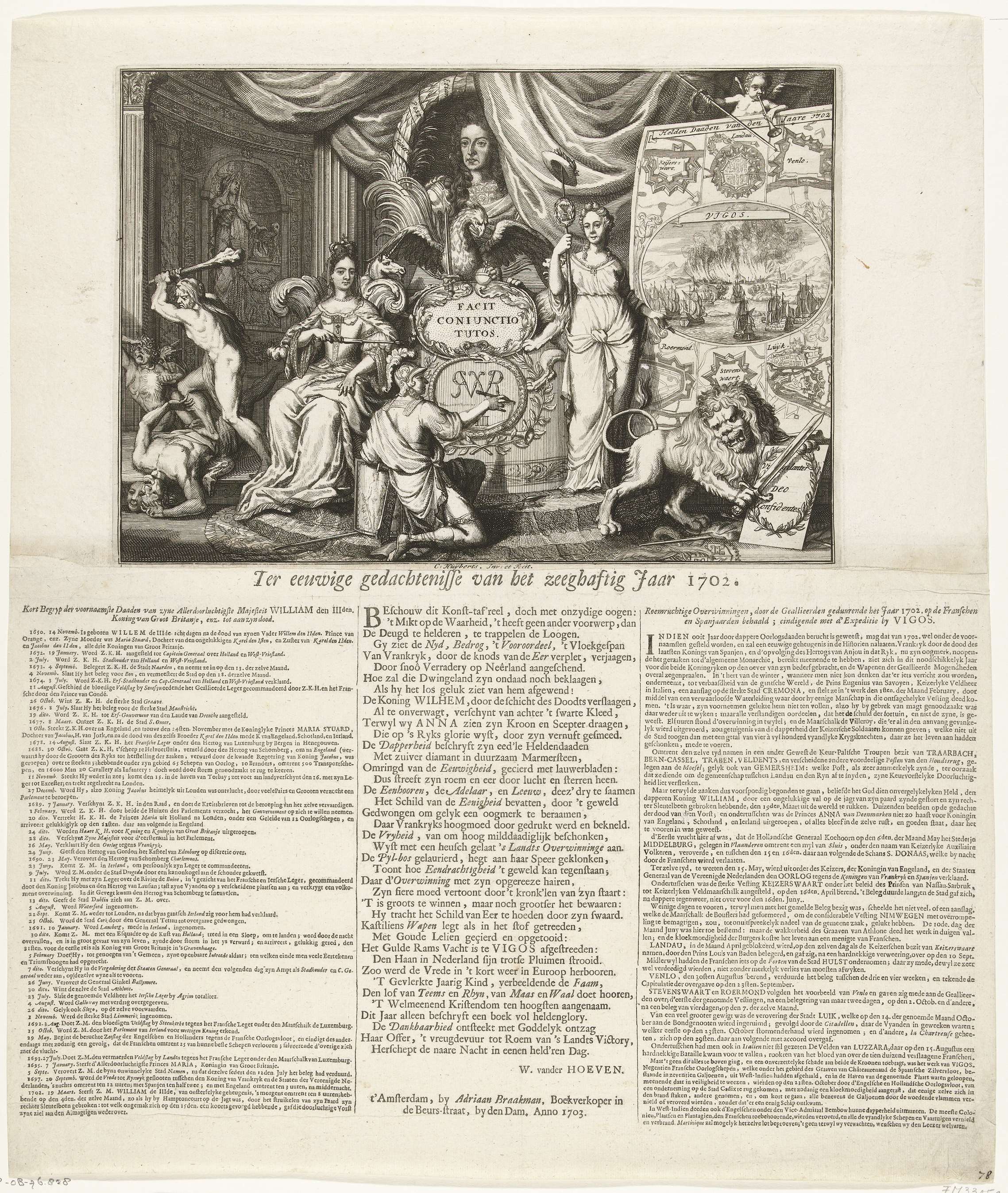 Allegorie op de geallieerde overwinningen op de Fransen in het jaar 1702. Het borstbeeld van de gestorven koning Willem III in lauwerkrans met onderschrift, links koningin Anna zittend op haar troon en Hercules monsters verslaand; rechts de Vrijheid met de Nederlandse Leeuw bij een tafereel van de overwinning in de zeeslag in de baai van ...