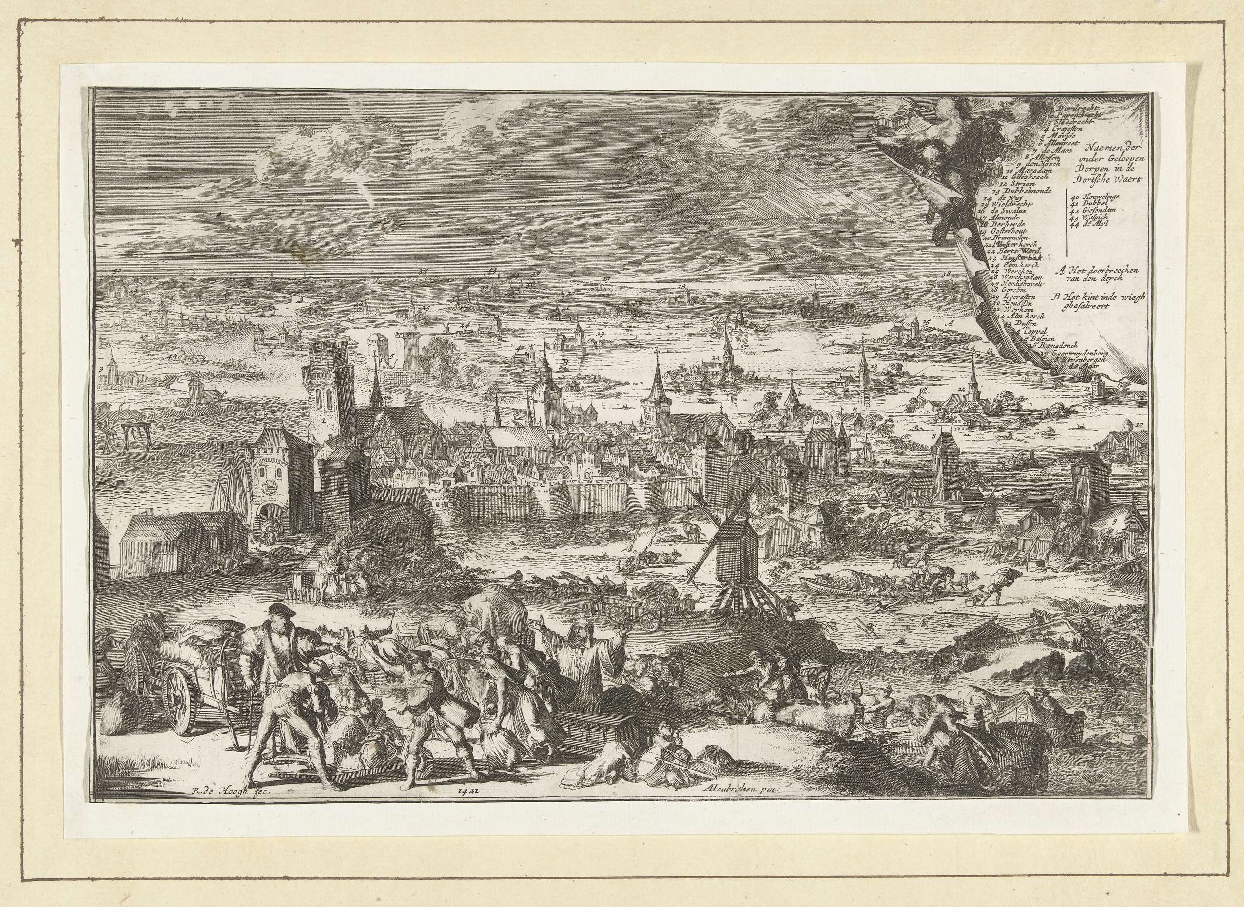 Doorbraak van de Zuid-Hollandsche dijk bij Dordrecht in de nacht van 18 op 19 november 1421. Gezicht op het land rondom Dordrecht. Met rechtsboven in een cartouche de namen der 44 ondergelopen dorpen en aanduiding van het geredde kind in een wieg, volgens overlevering de oorsprong van de naam Kinderdijk.