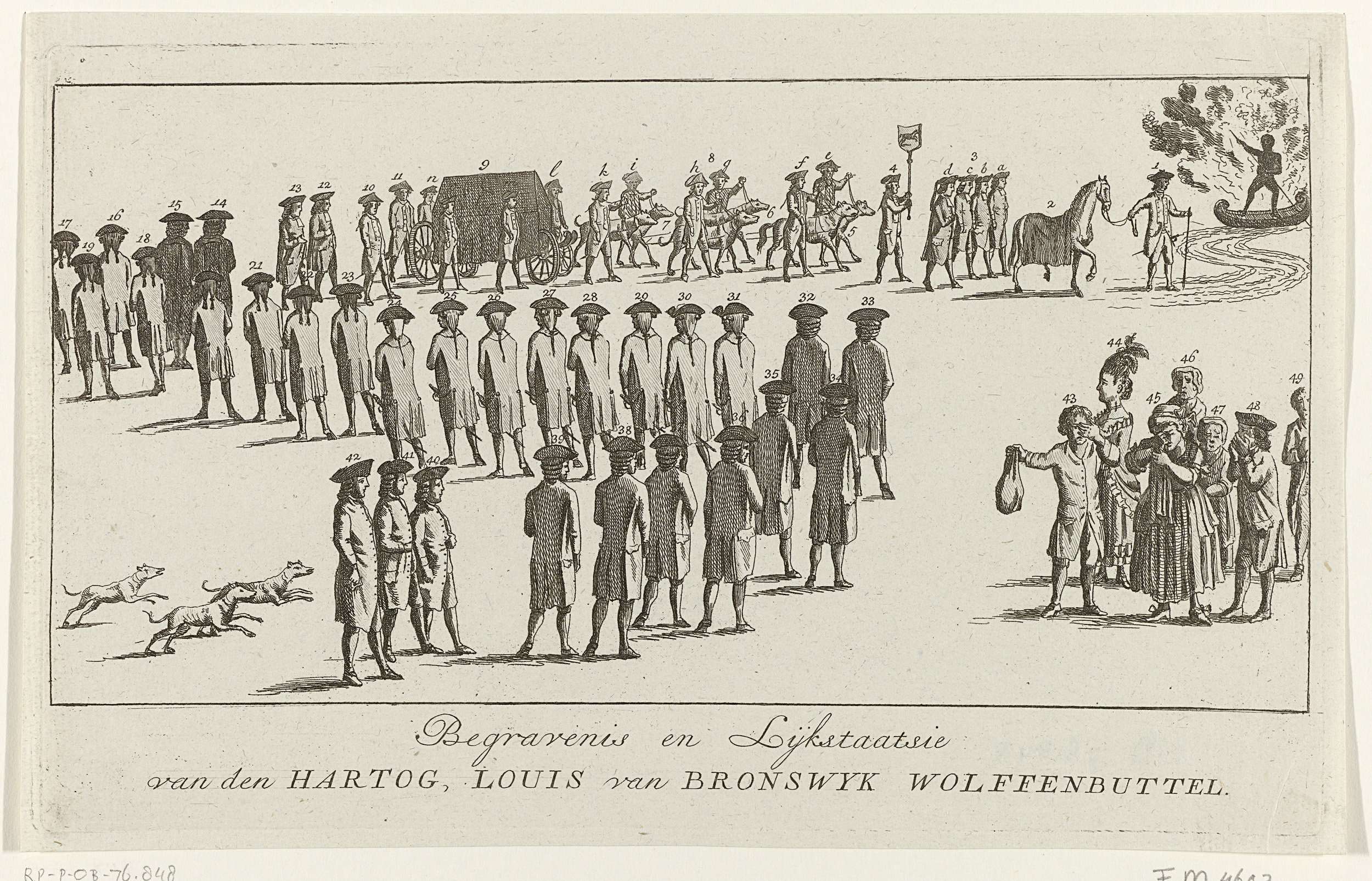 Spotprent op het vertrek van de hertog van Brunswijk uit Nederland op 14 oktober 1784. In de begrafenisstoet lopen achter de lijkwagen van de hertog, zijnde een vilderskar, de prins, aanhangers van de hertog en andere prinsgezinden. De stoet komt bovenaan uit bij Charon met zijn boot. Rechts een groepje treurende toeschouwers. Bij de prent ...