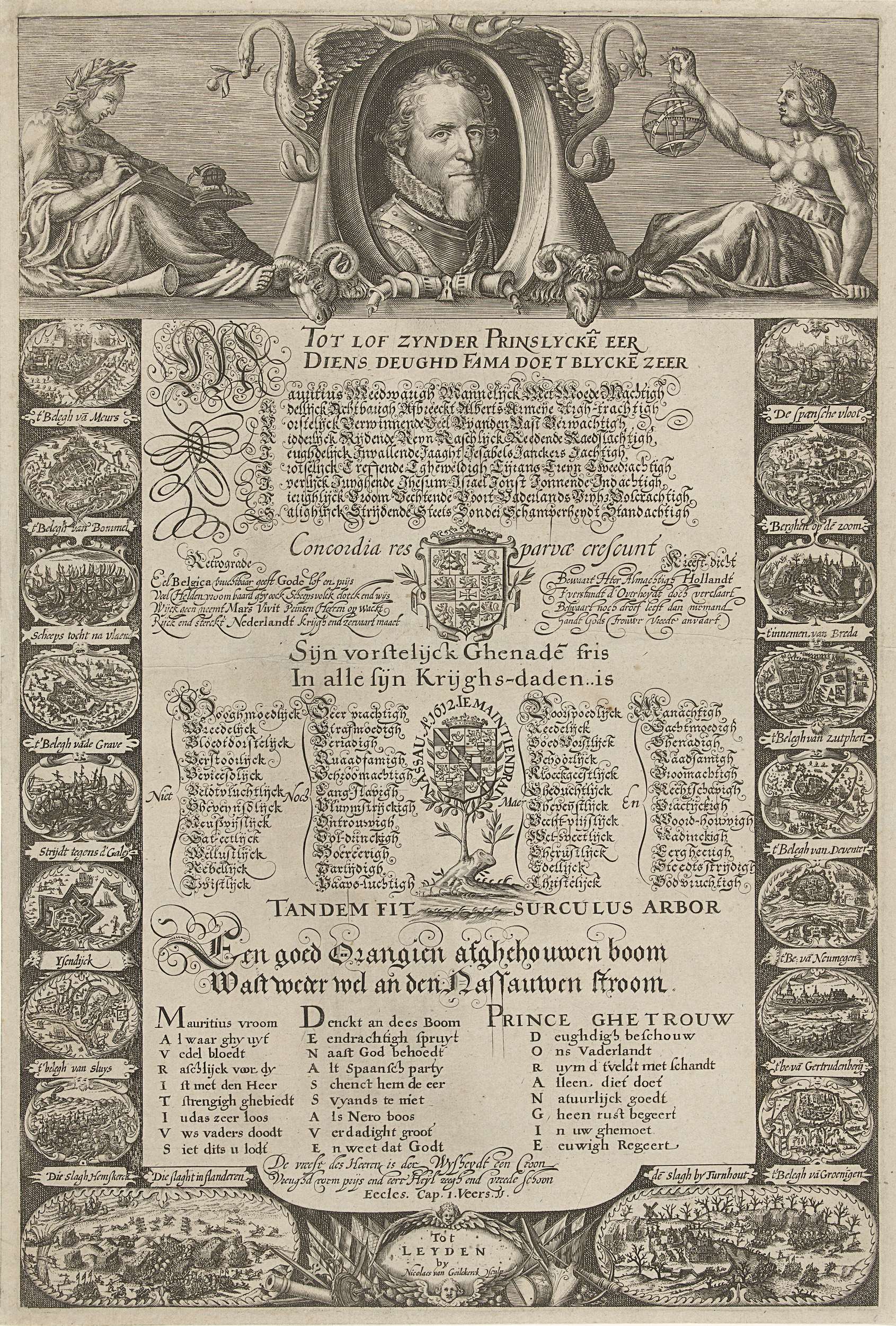 Blad met bovenaan een portret van Maurits in medaillon, ter weerszijden twee zinnebeeldige figuren van de Historie en de Weetenschap; lager verschillende Hollandse verzen en spreuken, waartussen een schild van de Republiek met de wapens van de verenigde provincies; daaronder zijn eigen wapen in de Oranjeboom met spreuk en datering 1612. Aan de linker- en ...