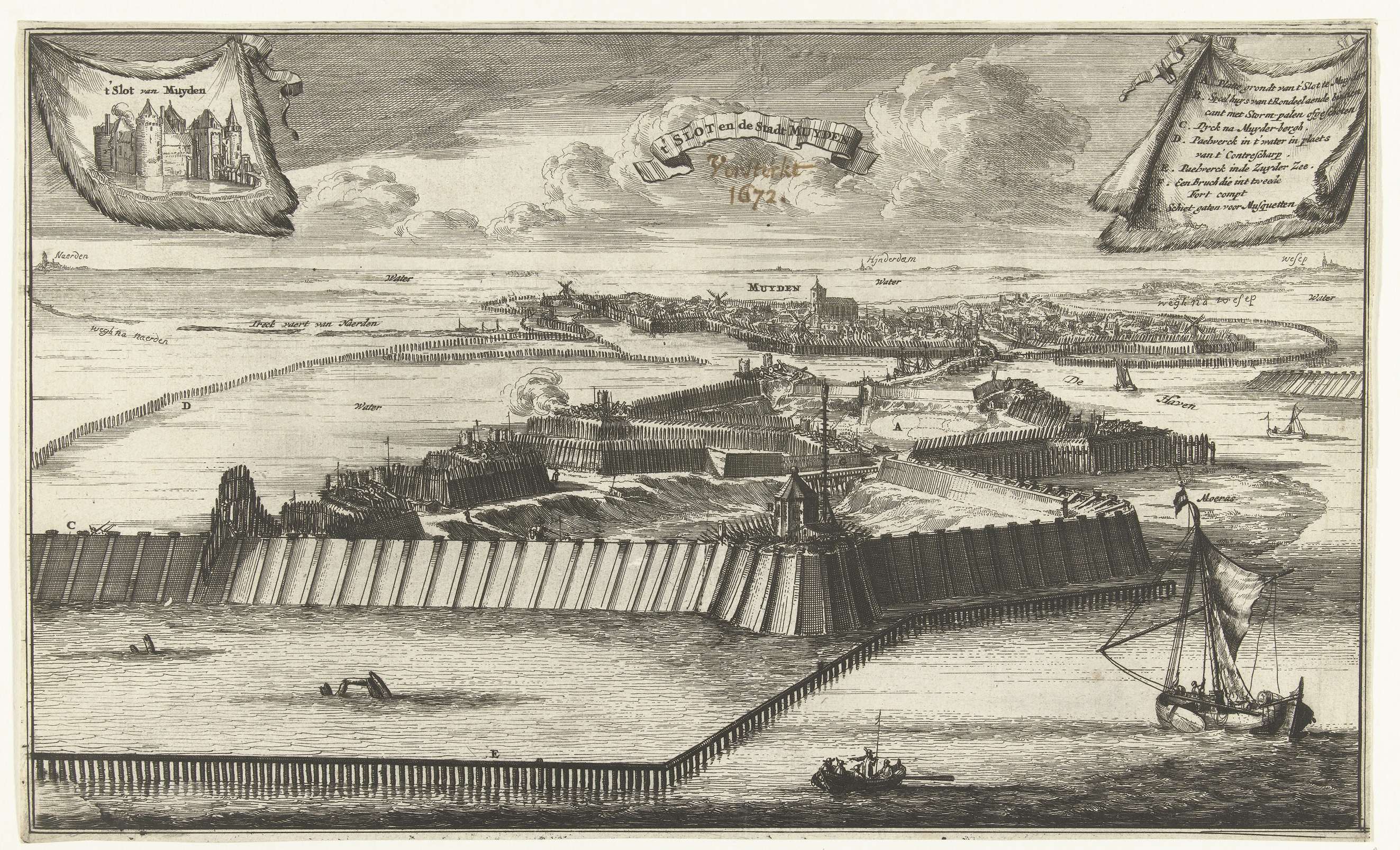 Het bouwen van een paalwerk en een versterkte sluis bij Muiden voor het inunderen tegen de Fransen, 13 mei 1673. Linksboven een doek met het Muiderslot, rechtsboven de legenda A-G.