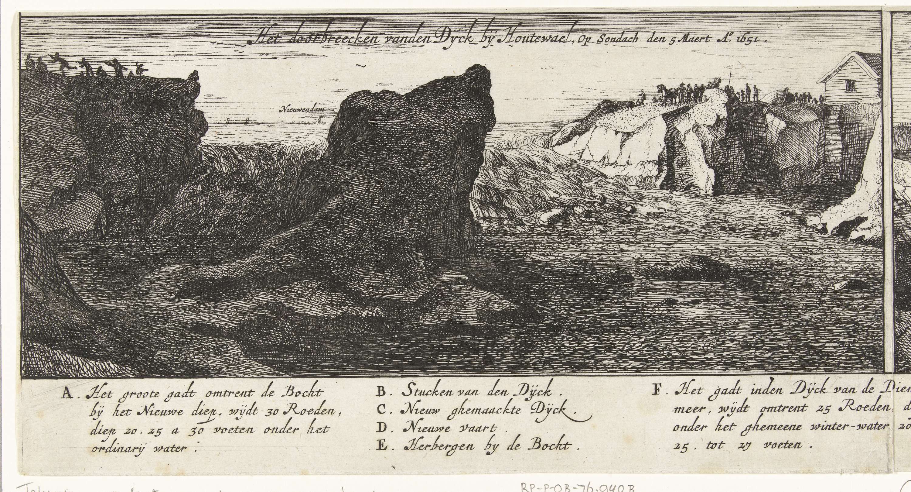 Het doorbreken van de Sint-Antoniesdijk of Diemerzeedijk bij Houtewael op 5 maart 1651. In het onderschrift de eerste helft van de legenda A-F. Onderdeel van een grote plaat bestaande uit vier afbeeldingen en een tekstblad met een vers.