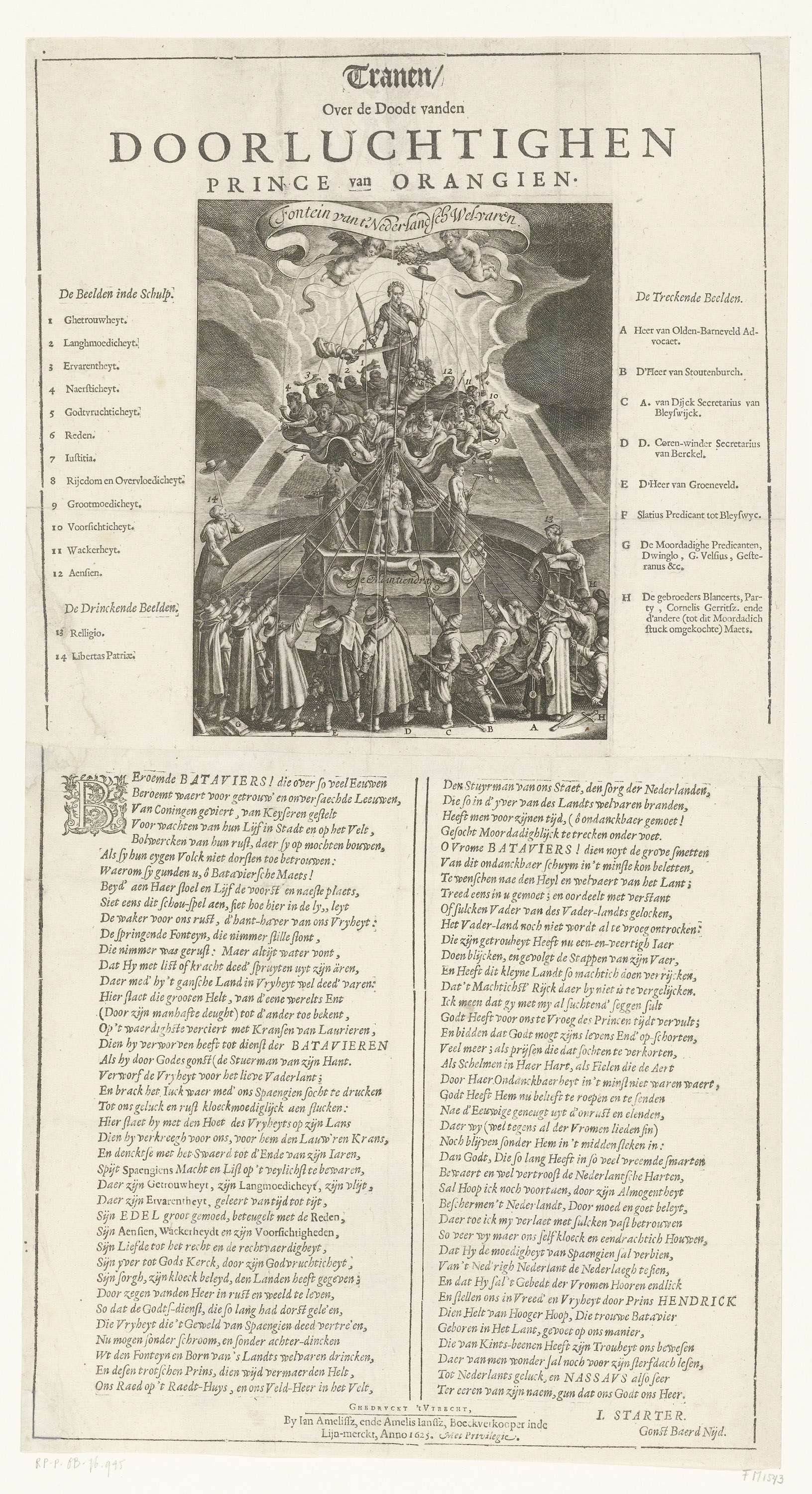 Allegorie ter ere van prins Maurits bij zijn overlijden, 1625. Prins Maurits staande in een grote schelp van de Fontein van t' Nederlandsch Welvaren. In de schelp twaalf allegorische figuren die de welvaart de de Republiek onder het bestuur van Maurits symboliseren. Uit het water van de fontein drinken de personificaties van Vrijheid van het ...