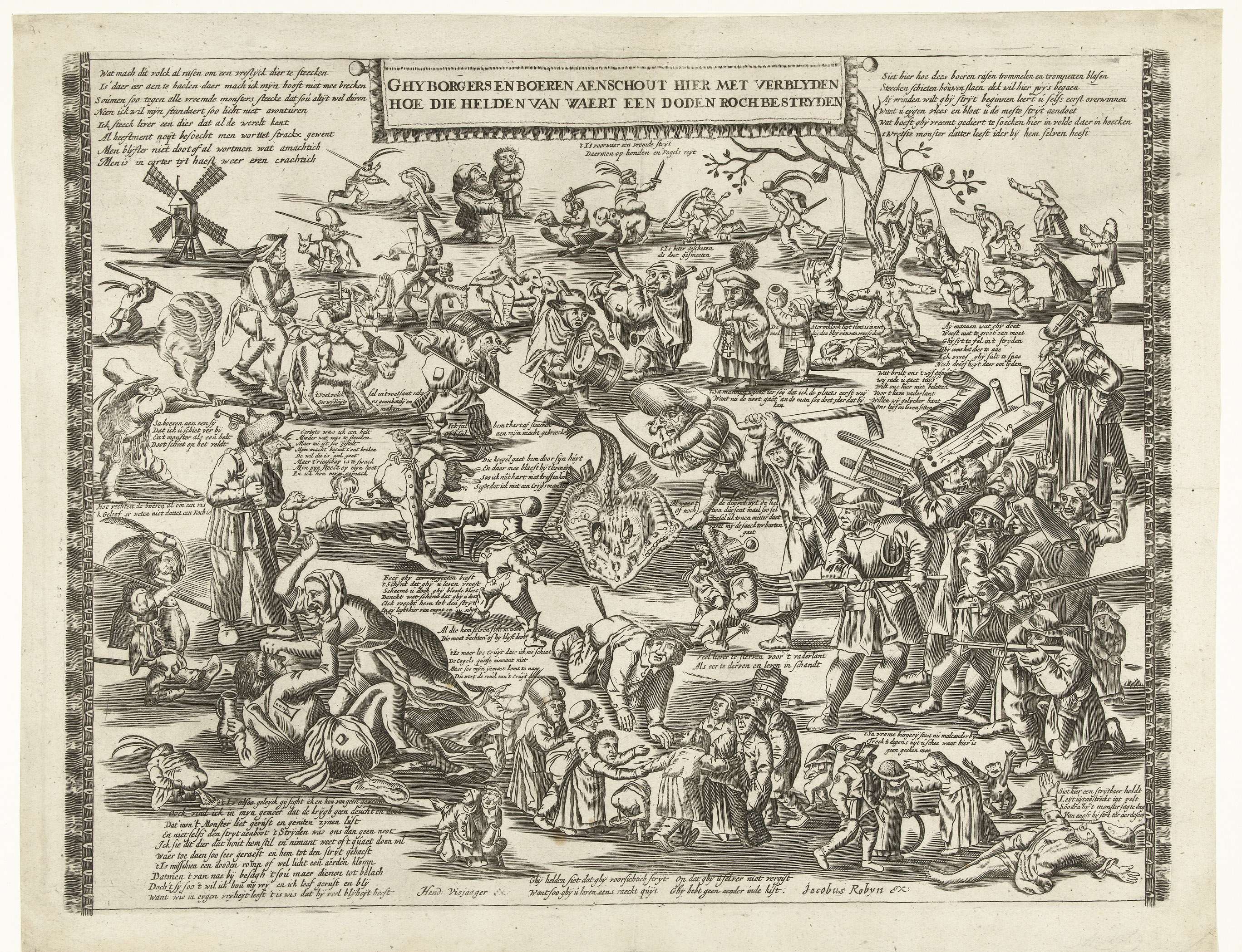 De Rogstekers van Weert, ca. 1650. Spotprent waarin allerlei verschillende dwazen in het plaatsje Waert (Weert in Limburg) ten strijde trekken tegen (het denkbeeldige gevaar van) een dode rog. In het midden een grote rog, waarop een kanon wordt afgevuurd. Linksachter een molen; rechtsachter een boom waaraan een klok die wordt geluid. Over het hele ...