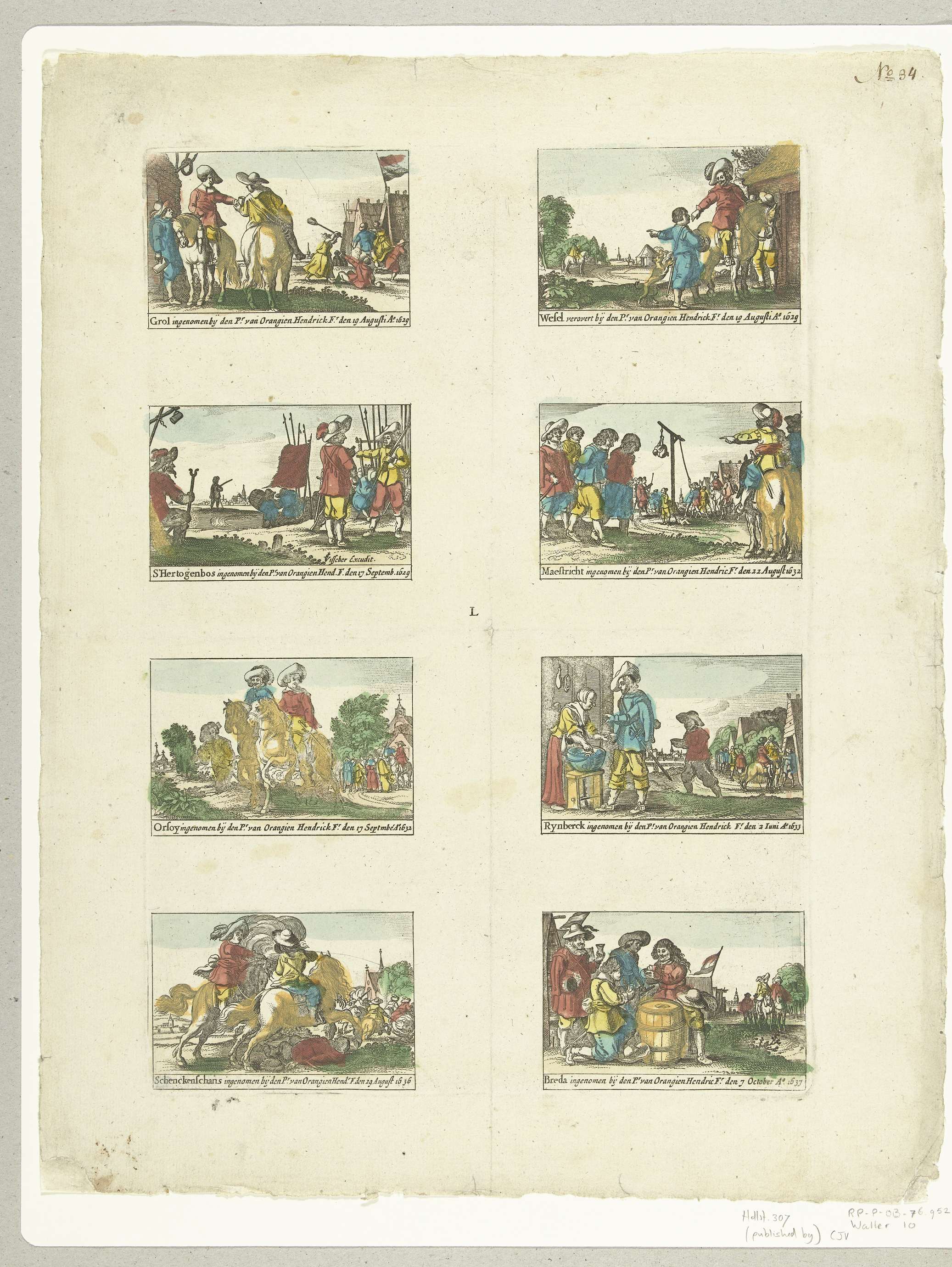 Blad met 8 voorstellingen van overwinningen van Frederik Hendrik in de jaren 1629-1637, waaronder Grol (1629), Wesel (1629), Den Bosch (1629), Maastricht (1632), Orsoy (1632), Rijnberg (1633), Schenkenschans (1636) en Breda (1637). Acht aparte scènes gedrukt van één plaat. Onder elke afbeelding een regel onderschrift. Gemerkt in het midden: L.