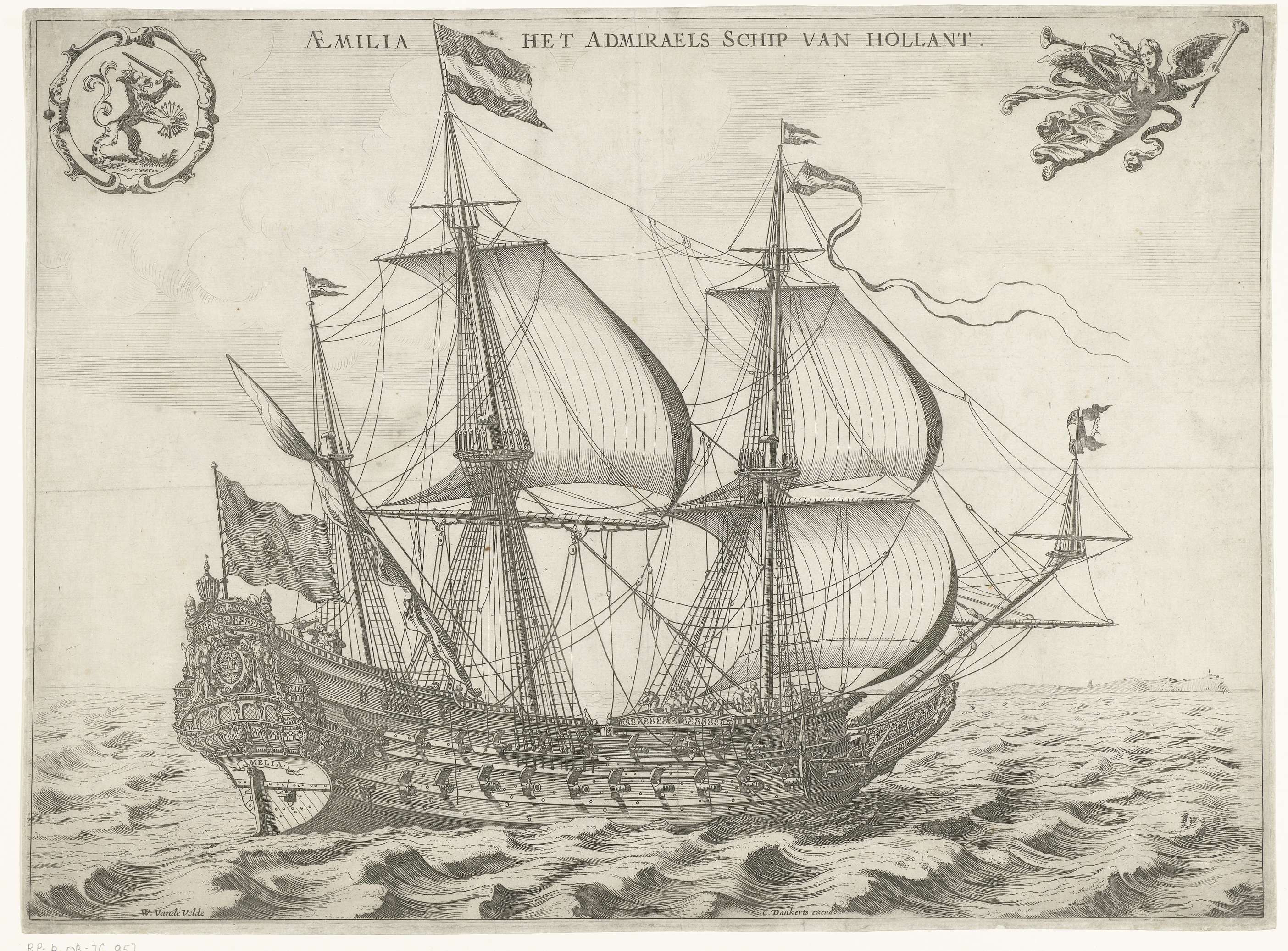 De Aemilia, het vlaggenschip van Holland, van Maarten Harpertsz. Tromp (tijdens de slag bij Duins in 21 oktober 1639), ca. 1639. Het schip in de volle lengte met alle zeilen; op de achtersteven de naam Amelia te lezen. In de lucht het wapen van de Republiek en de Faam met twee bazuinen.