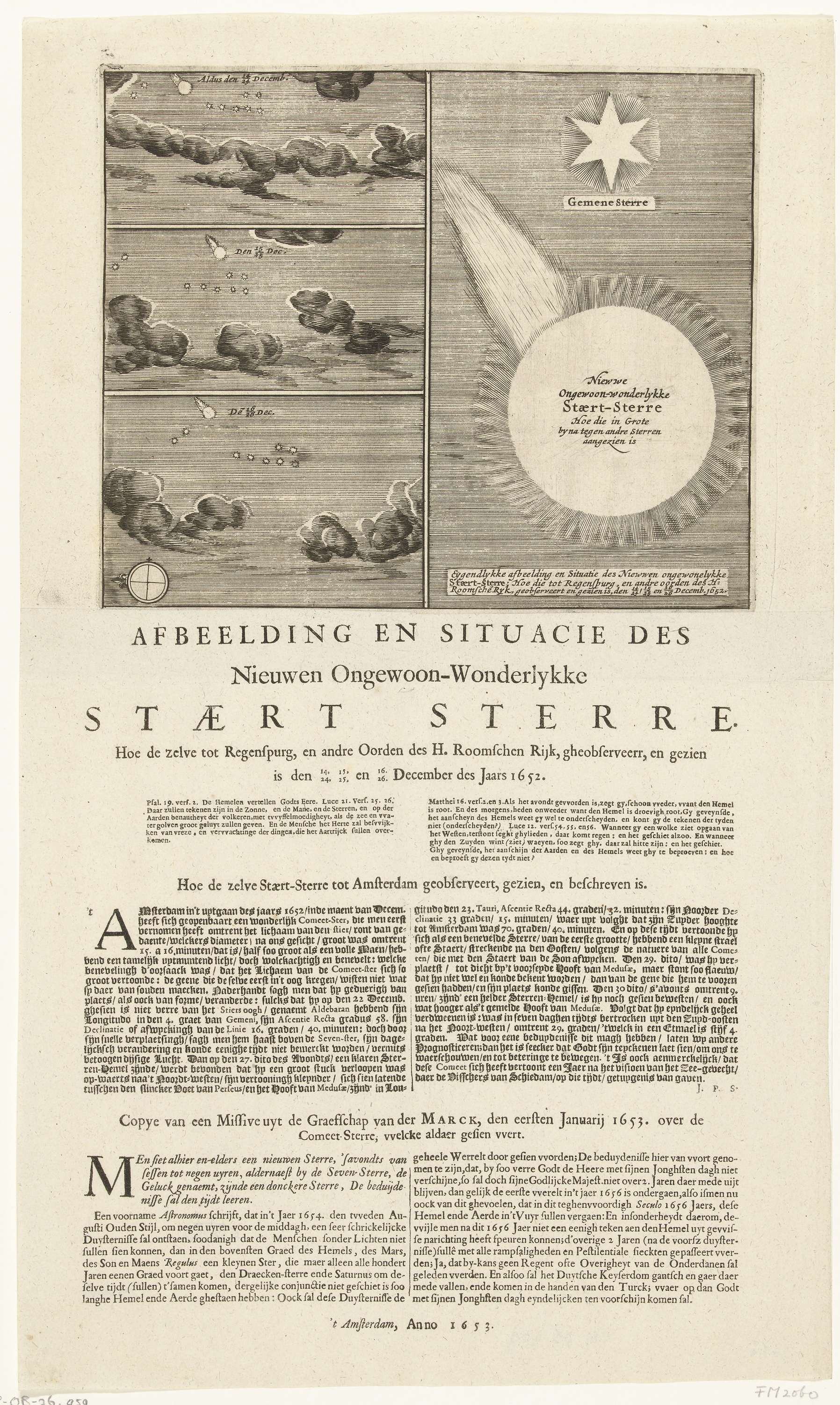 Blad met vier afbeeldingen van de komeet zoals deze is gezien in Regensburg op 24, 25 en 26 december 1652. Onder de afbeelding van de staartster een beschrijving in 2 kolommen van observaties in Regensburg, Amsterdam en graafschap van der Mark.