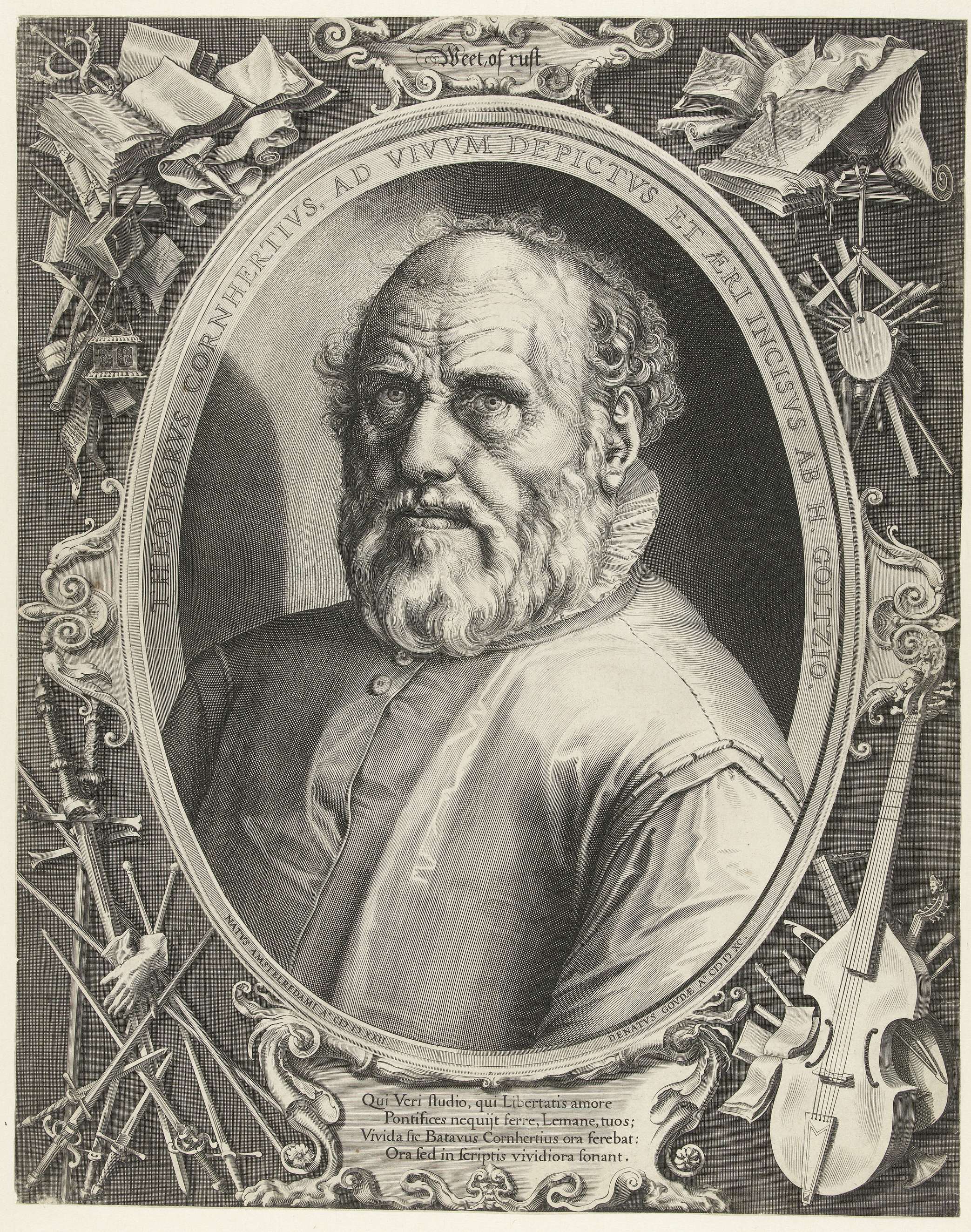 Portret in ovaal van de humanist en kunstenaar Dirck Volckertsz. Coornhert (1522-1590), met ornamentomlijsting (van aparte plaat gedrukt). Opschrift in het Nederlands en onderschrift in het Latijn in de ornamentomlijsting. Randschrift in het Latijn rond het portret, waarin melding gemaakt wordt van Coornherts geboorte- en sterfjaren, en van het feit dat Goltzius hem naar het ...