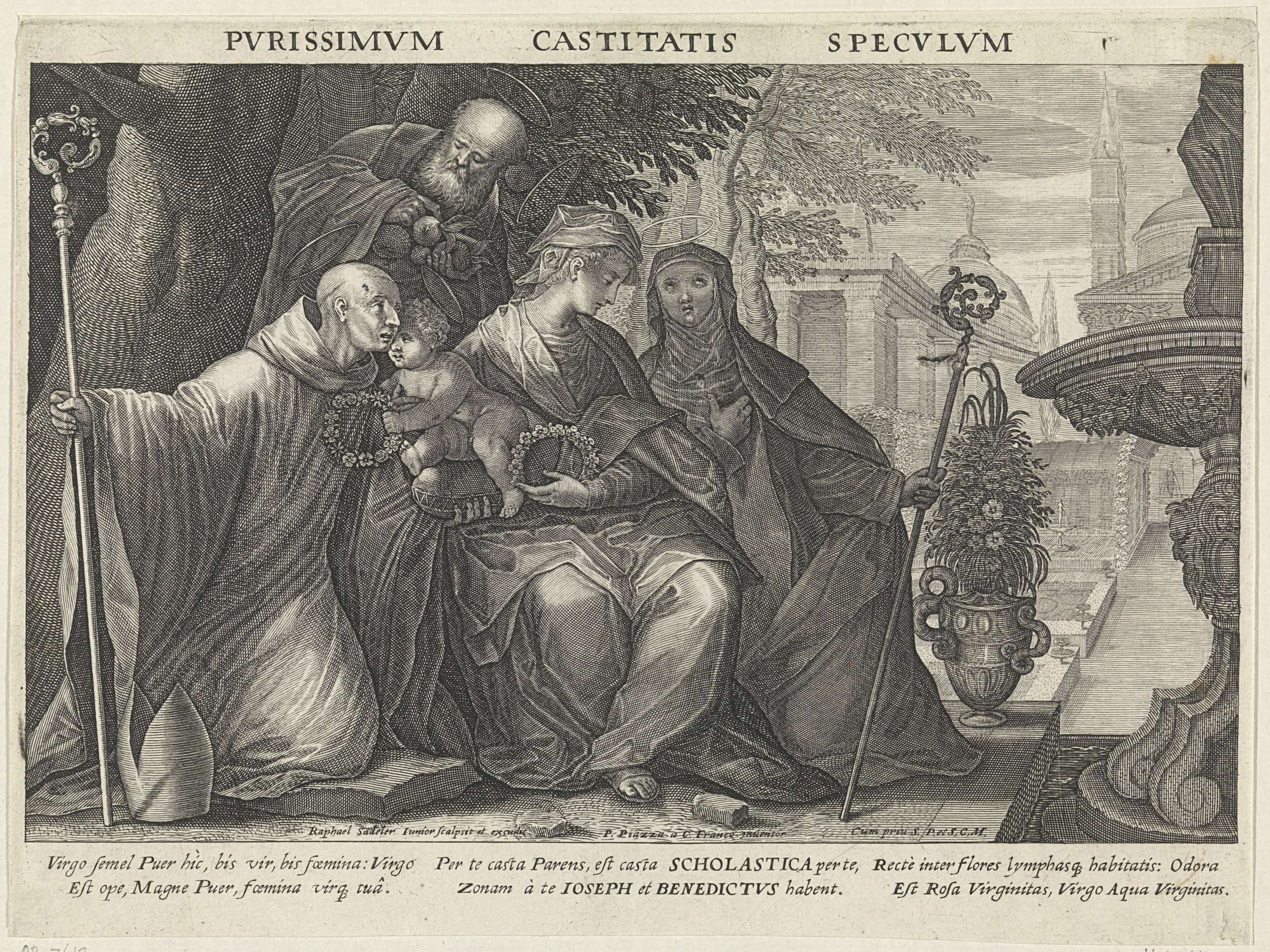 De Heilige familie met de H. Benedictus en de H. Scholastica. Op de achtergrond klassieke gebouwen. De H. Benedictus en de H. Scholastica zijn de voorbeelden van de gelofte van kuisheid. De prent is deel van een driedelige serie over de drie kloostergeloftes.