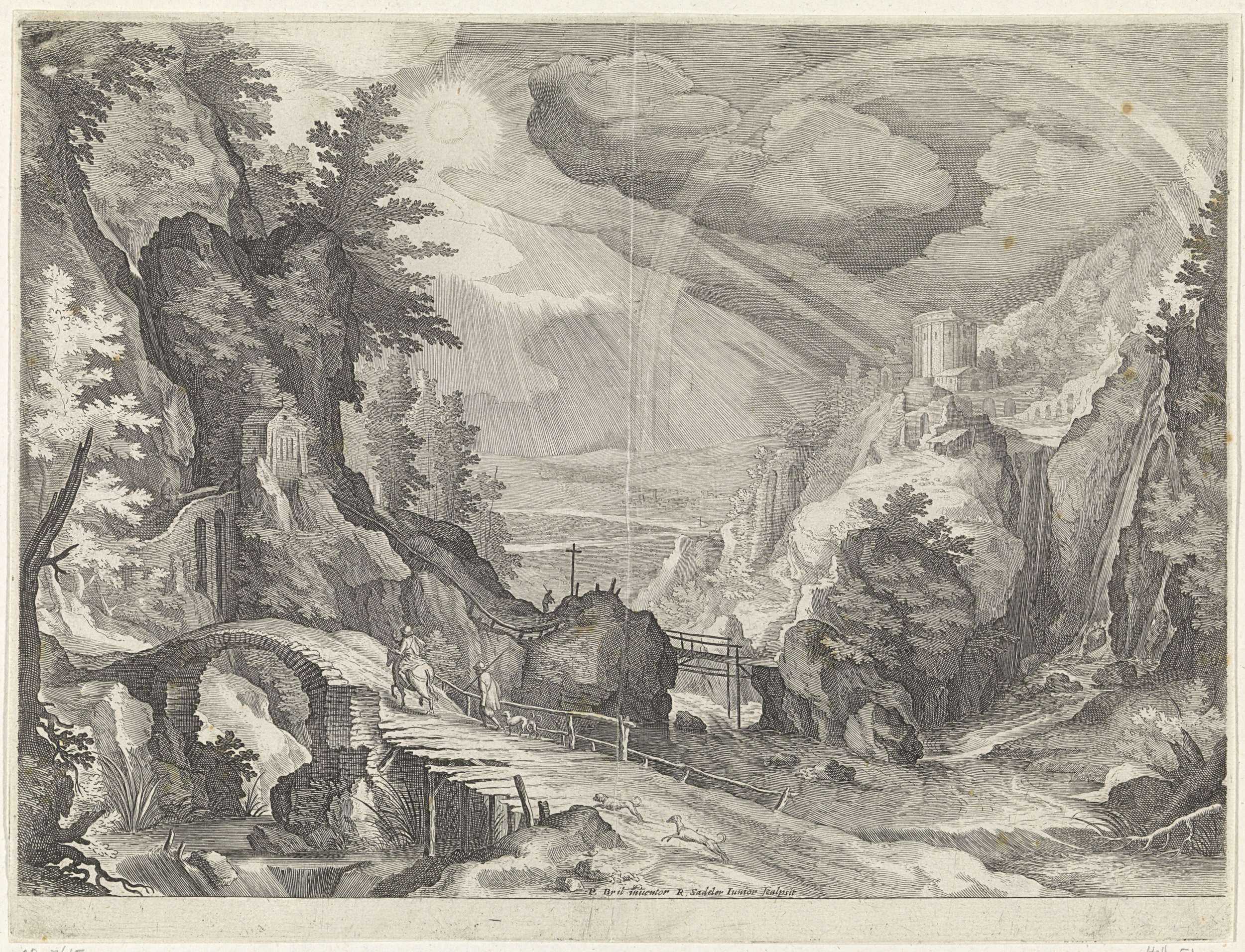 Bergachtig landschap met een brug met reizigers op de voorgrond. Op de achtergrond een gezicht op de watervallen van Tivoli alsook de antieke ruïnes van het stadje. In de lucht een regenboog.