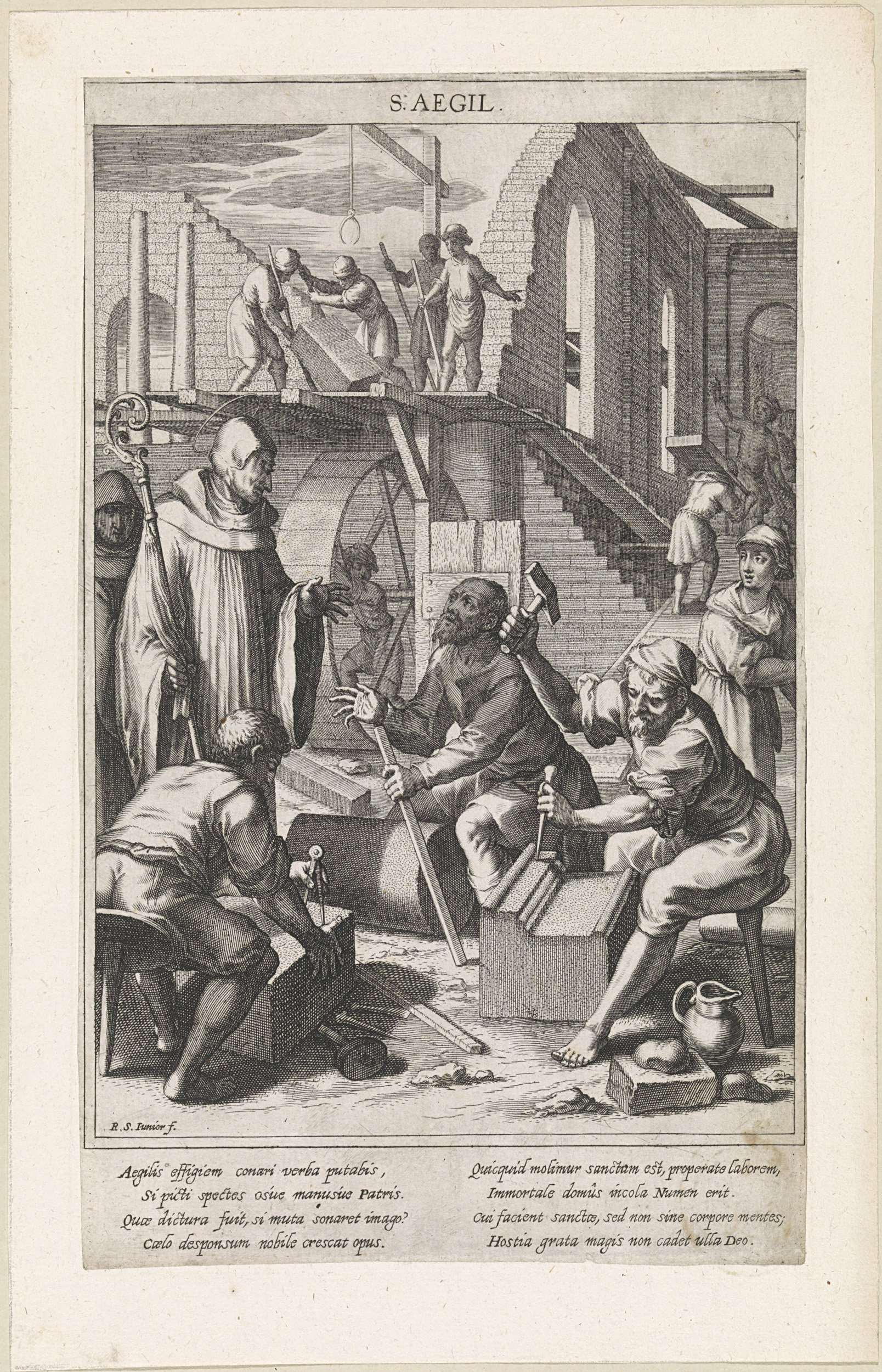 Agilbertus, bisschop van Freising. overziet de bouw van het klooster van Weihenstephan. De prent heeft een Latijns onderschrift.