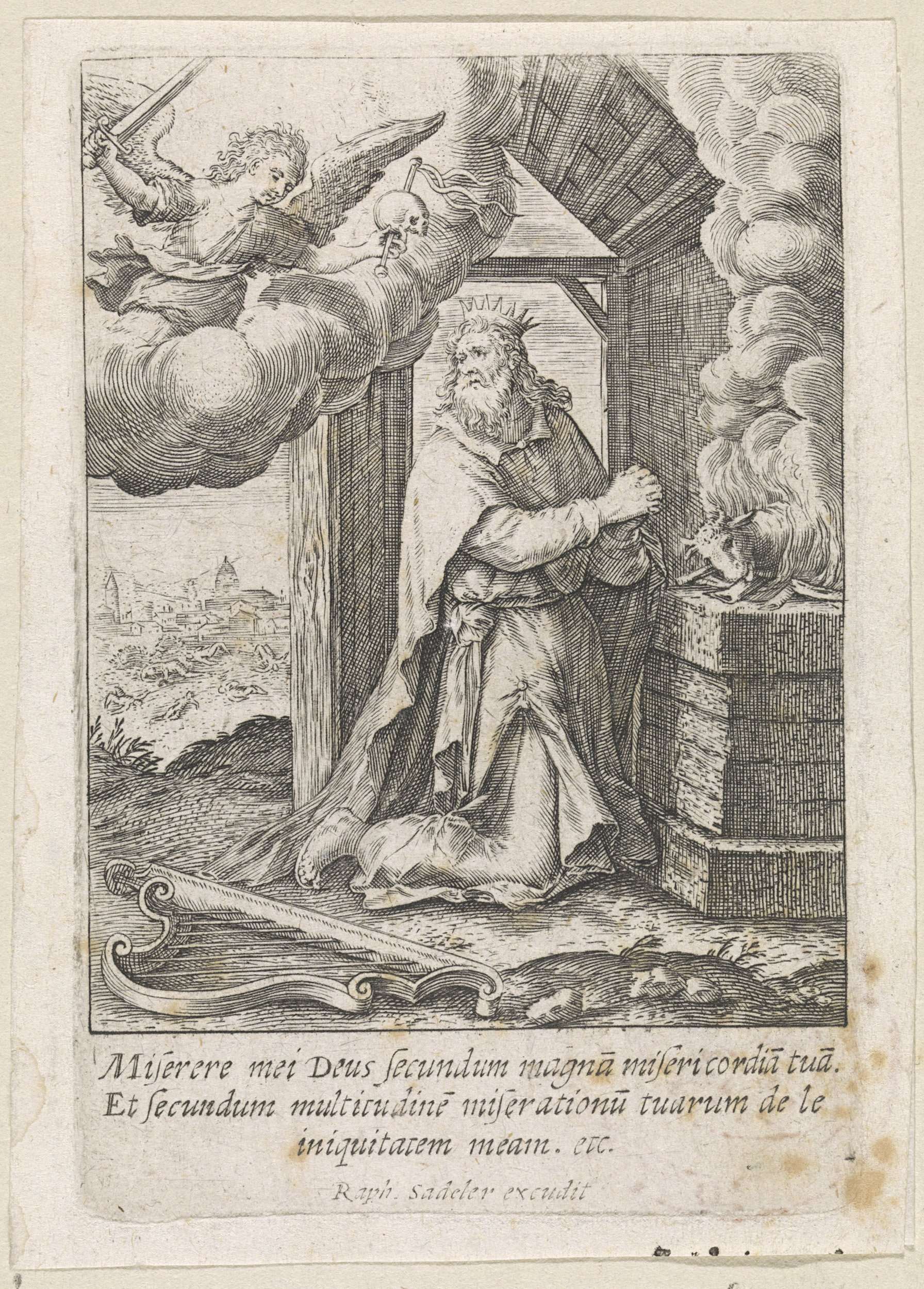 Op de dorsvloer van de Jebusiet Arauna heeft koning David een altaar gebouwd. Hij zit geknield voor het altaar en offert er runderen in de hoop een plaag te stoppen die het land teistert. Boven hem vliegt de engel des doods die de pest veroorzaakte. Op de achtergrond een vlakte, bezaaid met slachtoffers van de ...