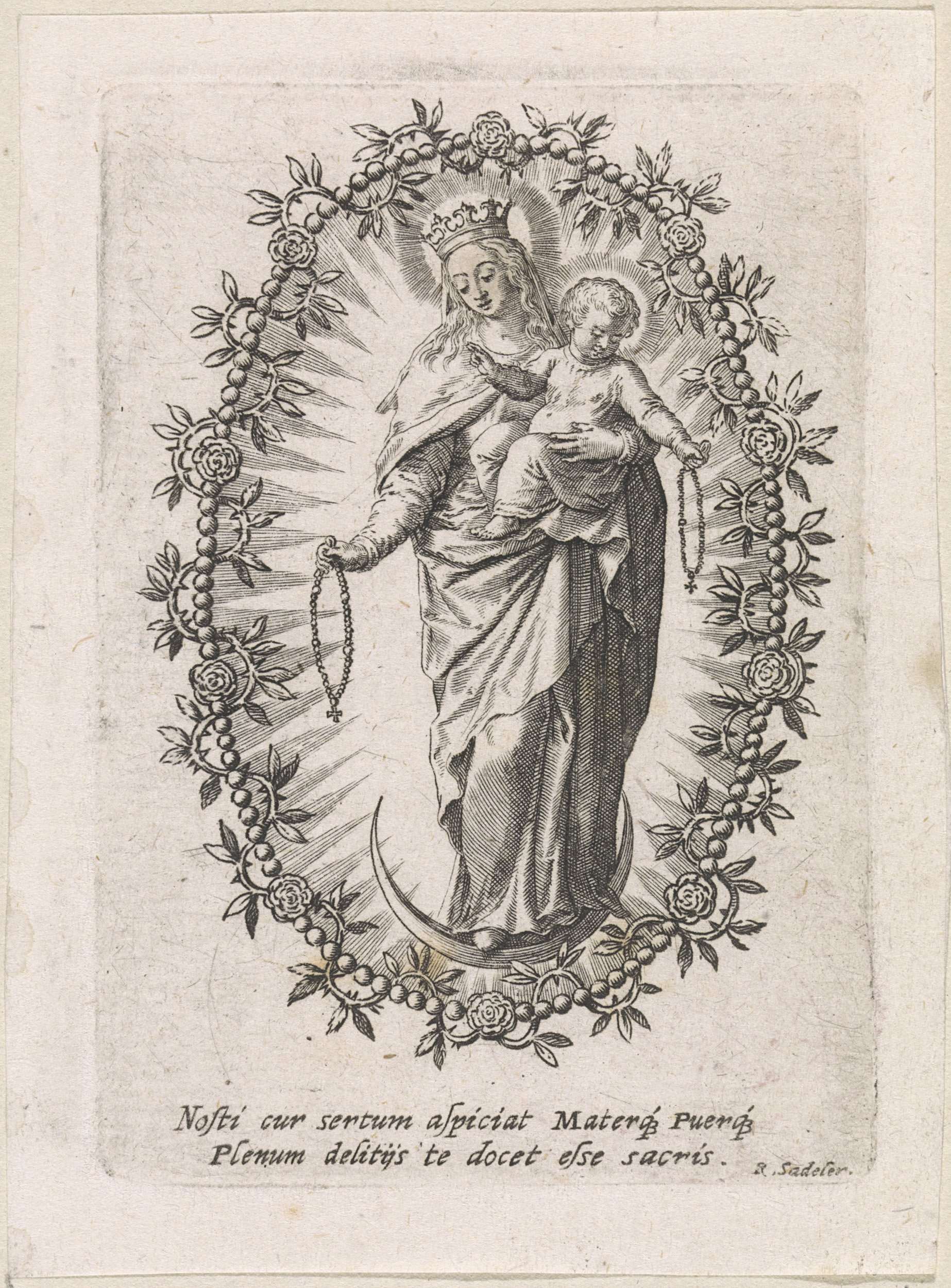 De maagd Maria met het Christuskind op haar arm. Ze staat op de maansikkel. Beiden met de rozenkrans in de hand en omringd door een krans van parels en rozen