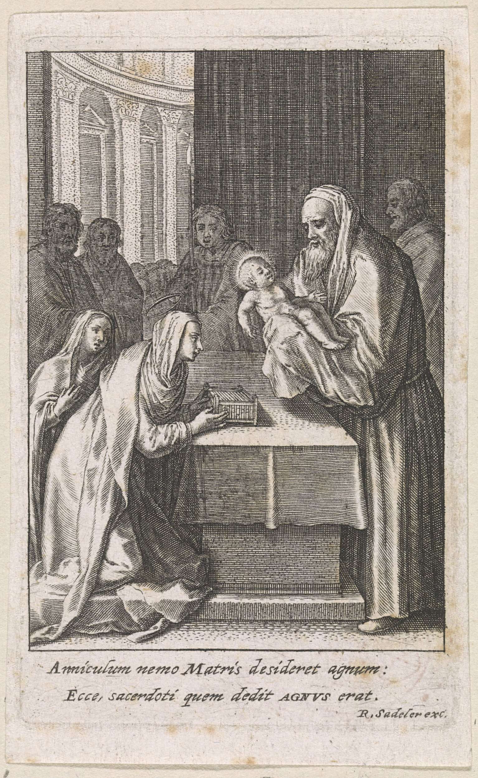 De presentatie van Christus in de tempel. De hogepriester staat achter het altaar en houdt het kind in de armen. Maria knielt voor het altaar.