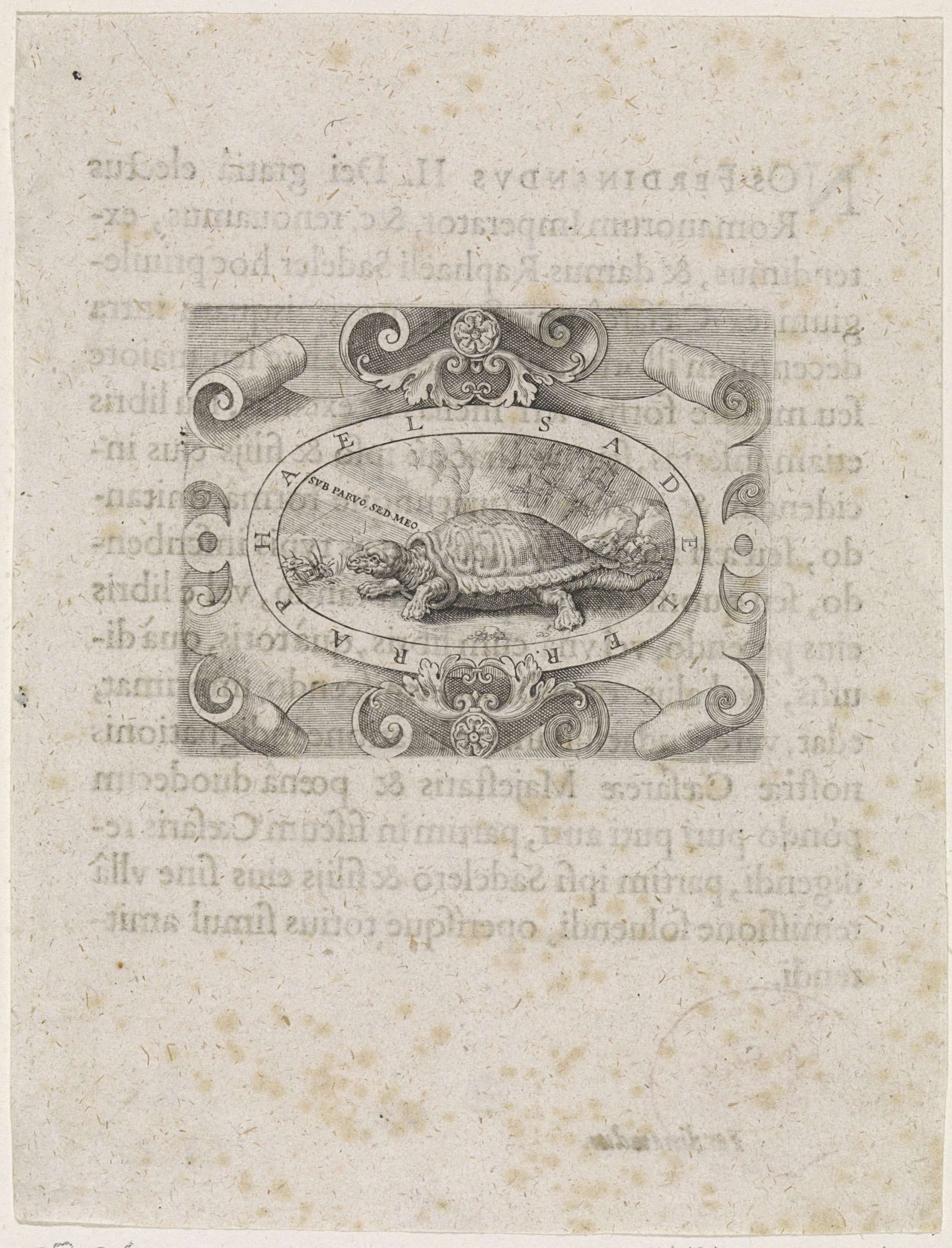 Een cartouche met een schildpad in een landschap en het motto: "sub parvus sed meo". Dit is het drukkersmerk van Raphaël Sadeler.