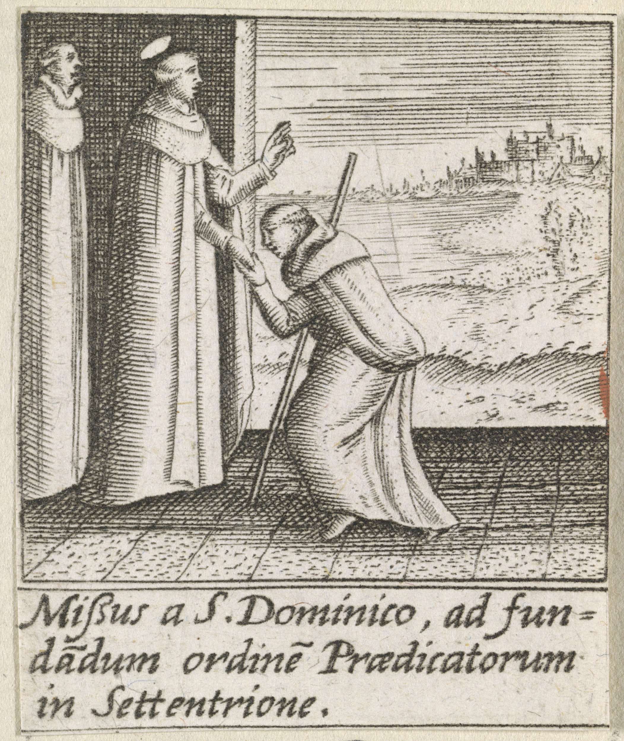 H. Hyacinthus van Polen wordt begroet door een monnik. Hij knielt en neemt de hand van de heilige vast. Op de achtergrond een stad. De prent maakt deel uit van een achttiendelige serie die een kader vormt rondom een afbeelding van de H. Hyacinthus van Polen.