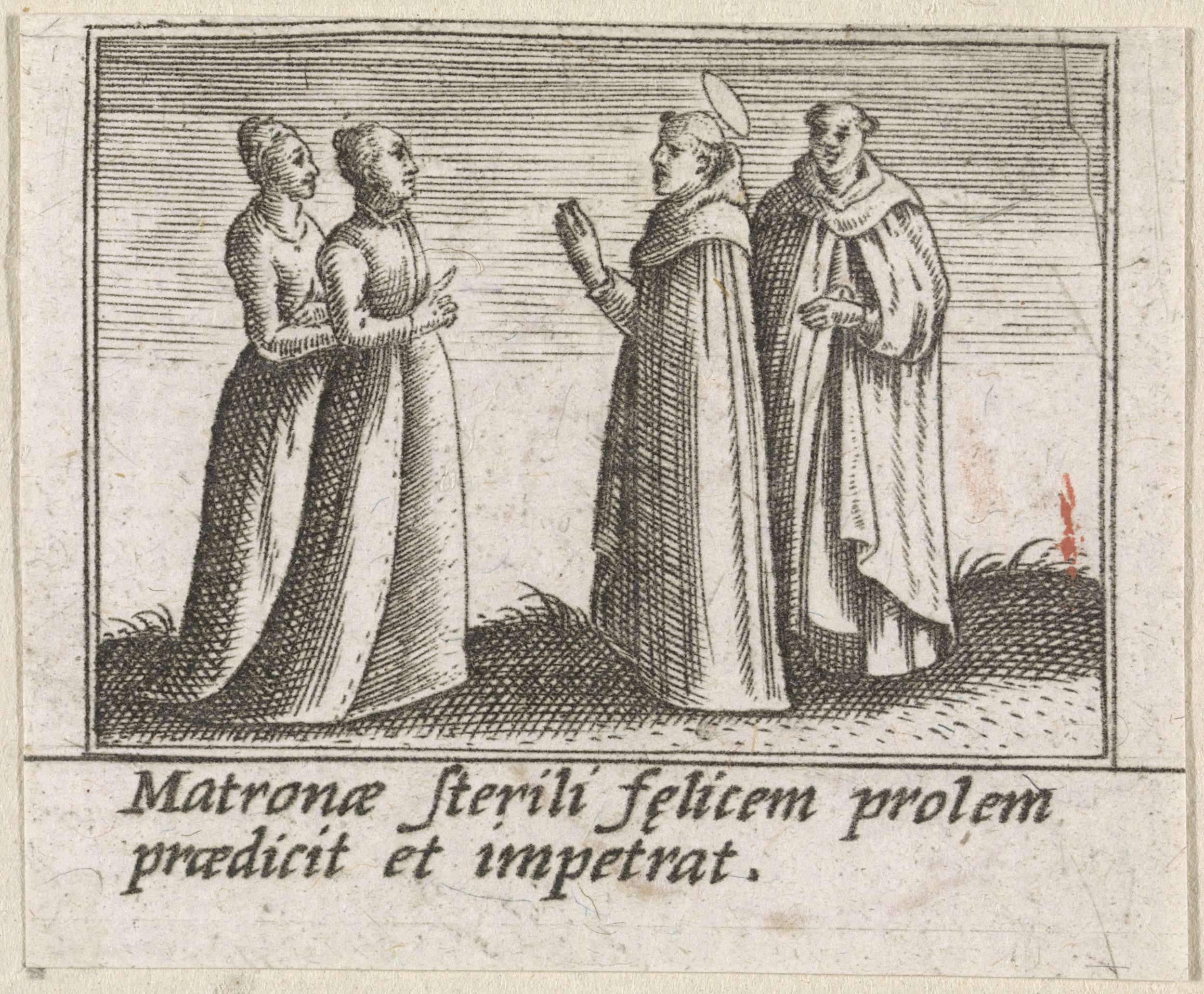 Twee onvruchtbare vrouwen worden door de H. Hyacinthus van Polen en een monnik begroet. De heilige geneest hen van hun onvruchtbaarheid. De prent maakt deel uit van een achttiendelige serie die een kader vormt rondom een afbeelding van de H. Hyacinthus van Polen.