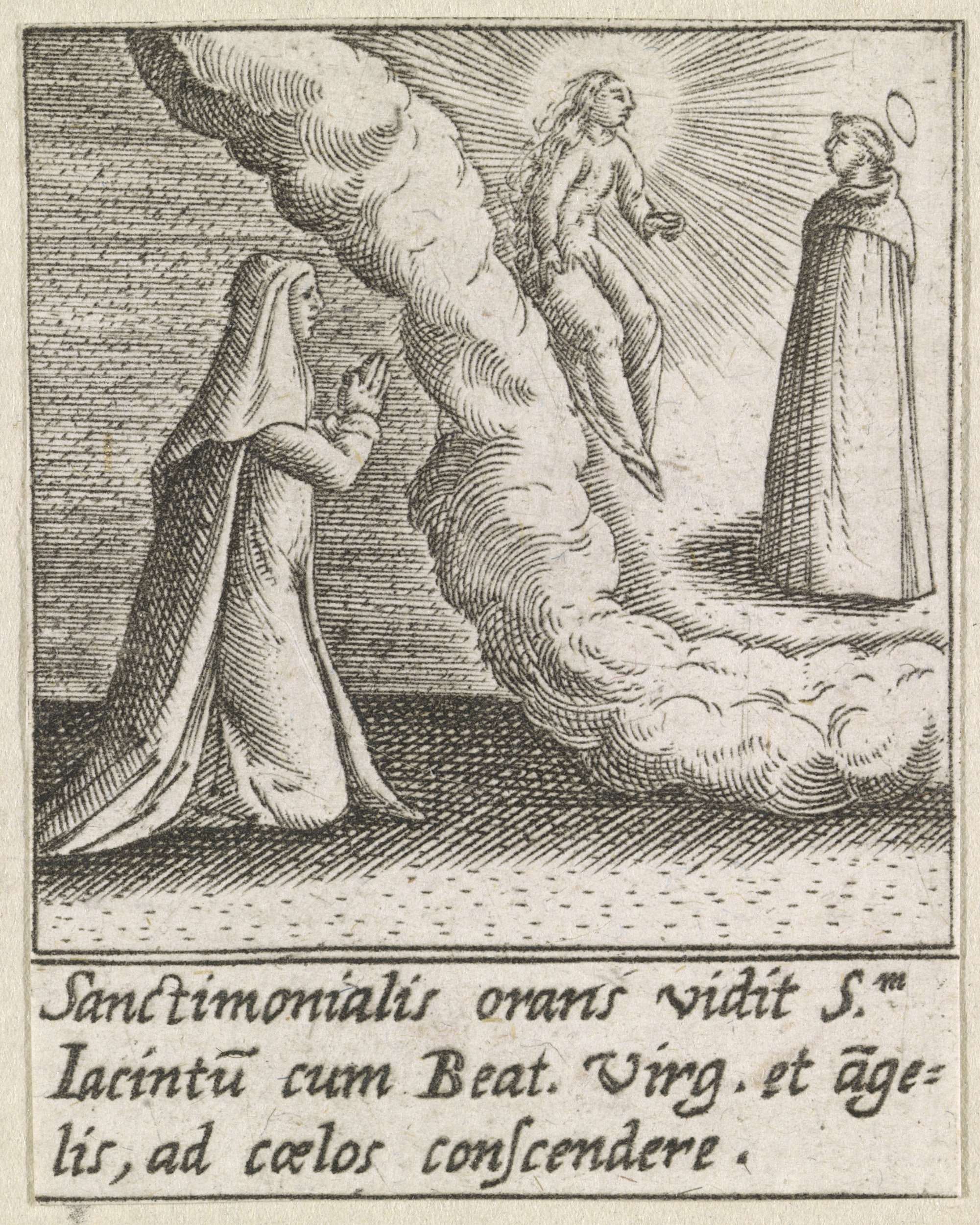 Een non bidt voor het visioen van de maagd Maria en de H. Hyacinthus van Polen. De prent maakt deel uit van een achttiendelige serie die een kader vormt rondom een afbeelding van de H. Hyacinthus van Polen.