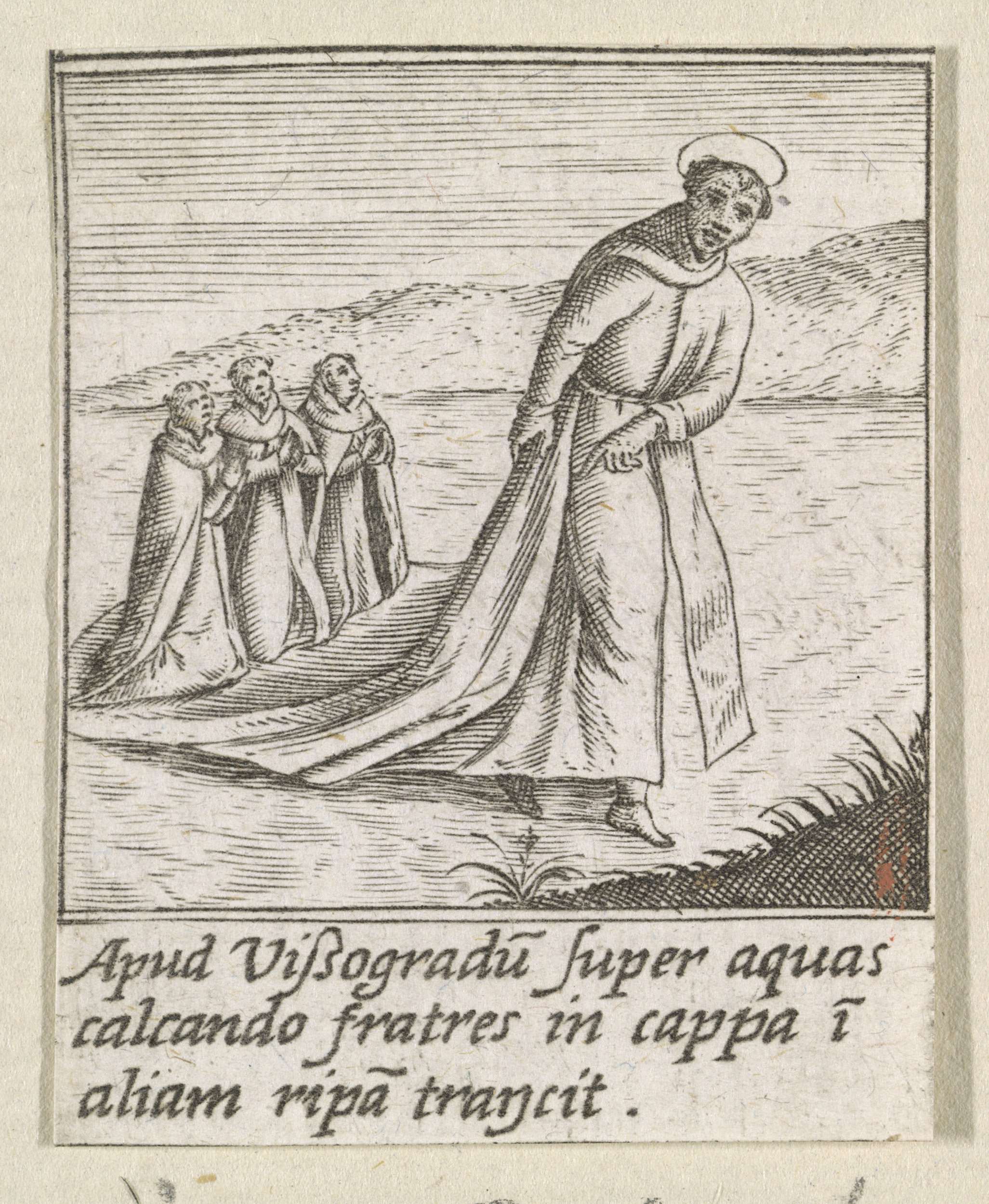 H. Hyacinthus van Polen loopt over de rivier de Dnepr. Op de achtergrond drie geknielde monniken. De prent maakt deel uit van een achttiendelige serie die een kader vormt rondom een afbeelding van de H. Hyacinthus van Polen.