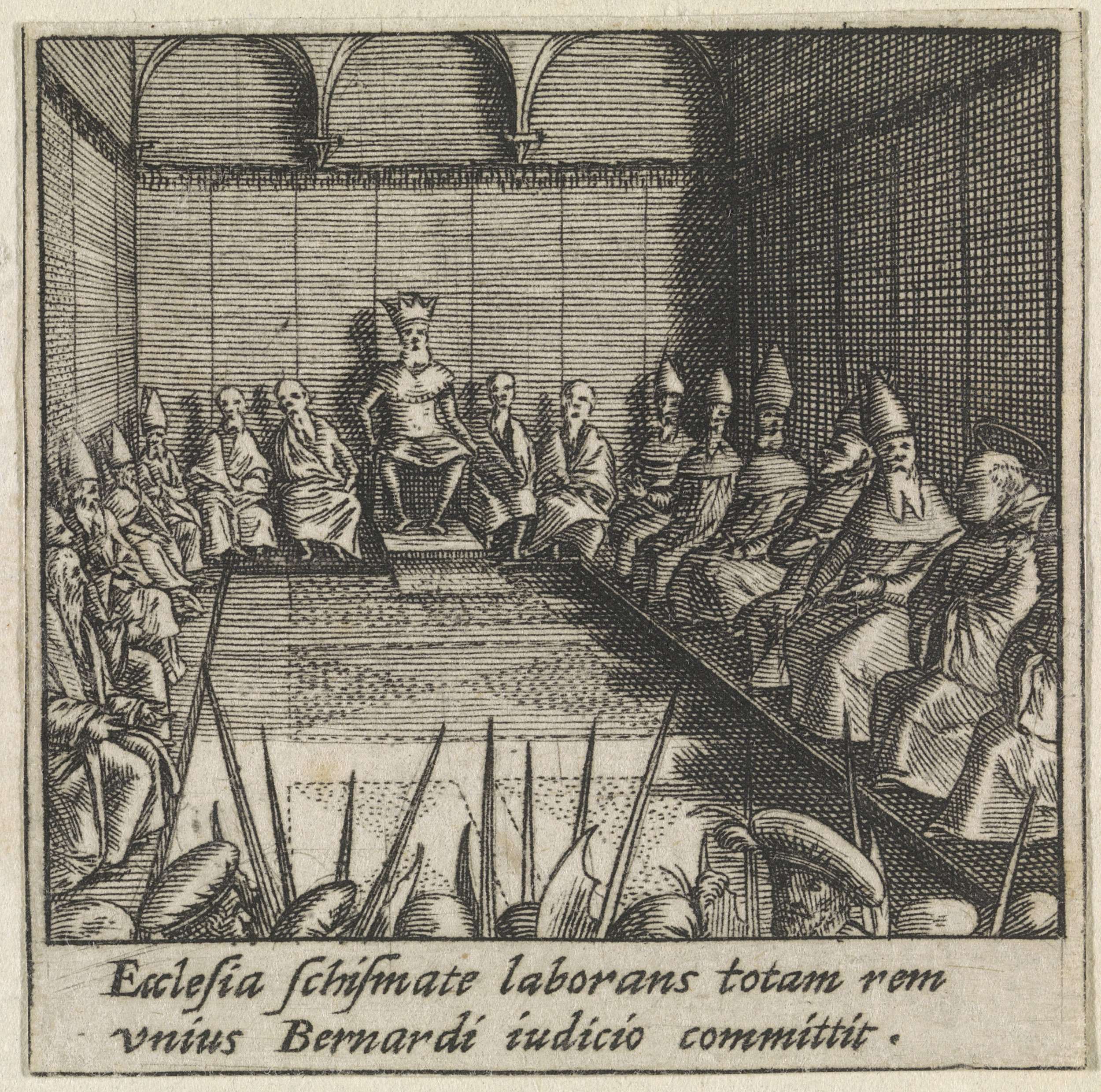Tijdens de synode van Étampes (1130) vergadert de H. Bernardus van Clairvaux met de geestelijken van de katholieke kerk en de koning van Frankrijk. Hij spreekt zich uit voor paus Innocentius II en vermijdt zo een schisma binnen de katholieke kerk. De prent maakt deel uit van een veertiendelige serie die een kader vormt rondom ...