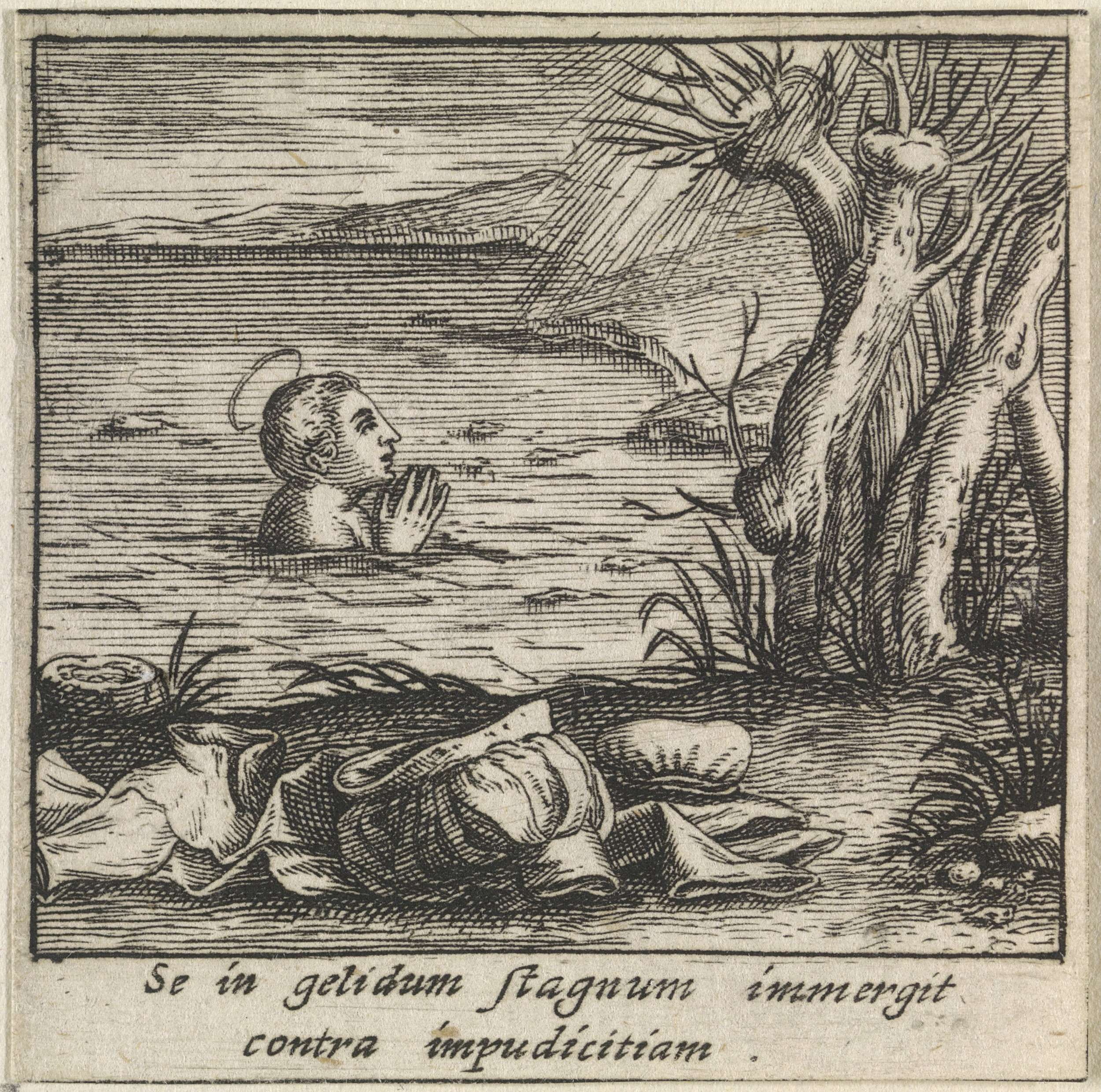 Om zich te beschermen tegen onkuise gedachten bidt de H. Bernardus van Clairvaux in het ijskoude water van een vijver. De prent maakt deel uit van een veertiendelige serie die een kader vormt rondom een afbeelding van de H. Bernardus van Clairvaux.