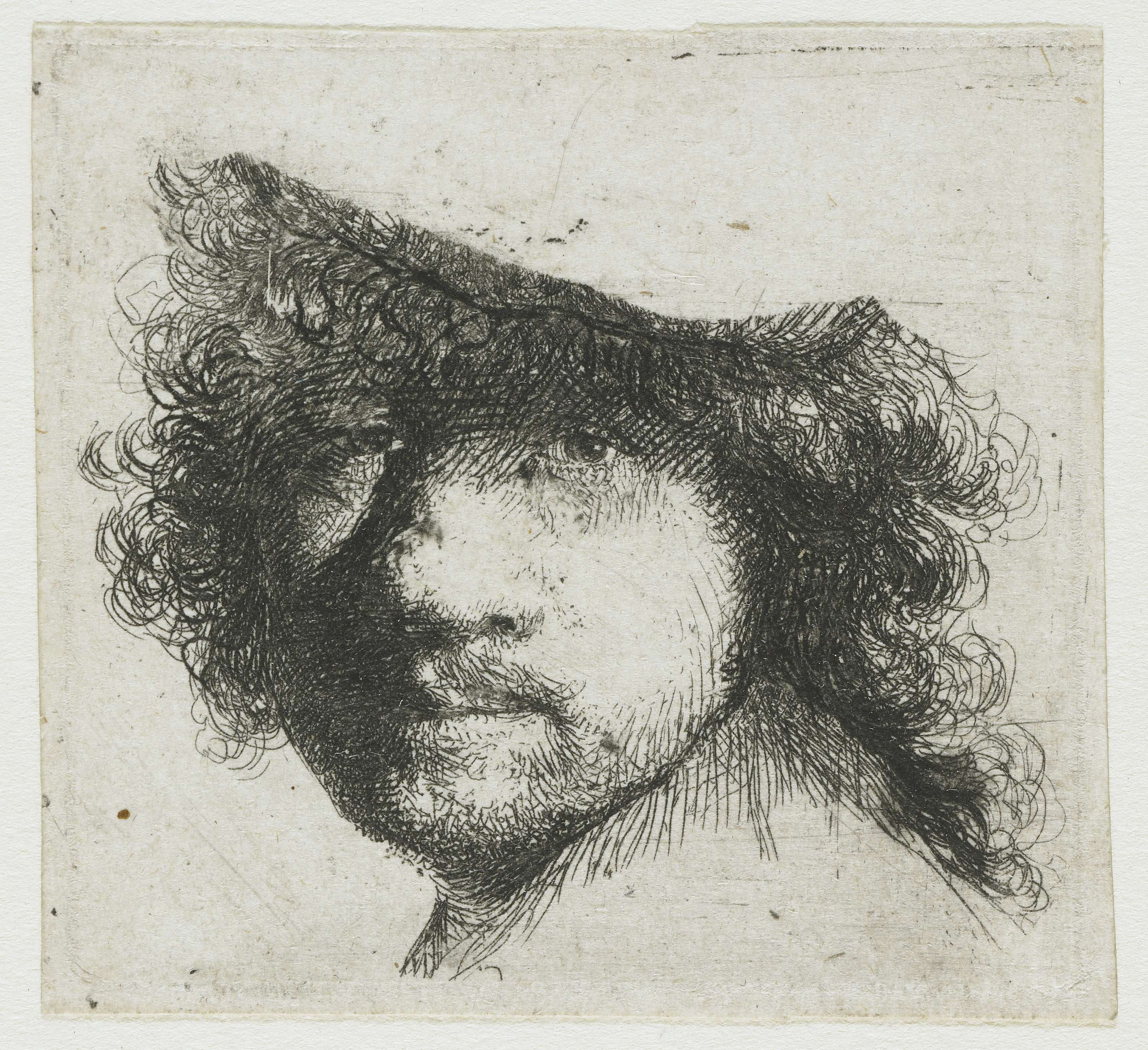 Uitgeknipt fragment met valse plaatranden van 'Studieblad met zelfportret, een paar bedelaars, koppen van oude man en een vrouw, etc.'