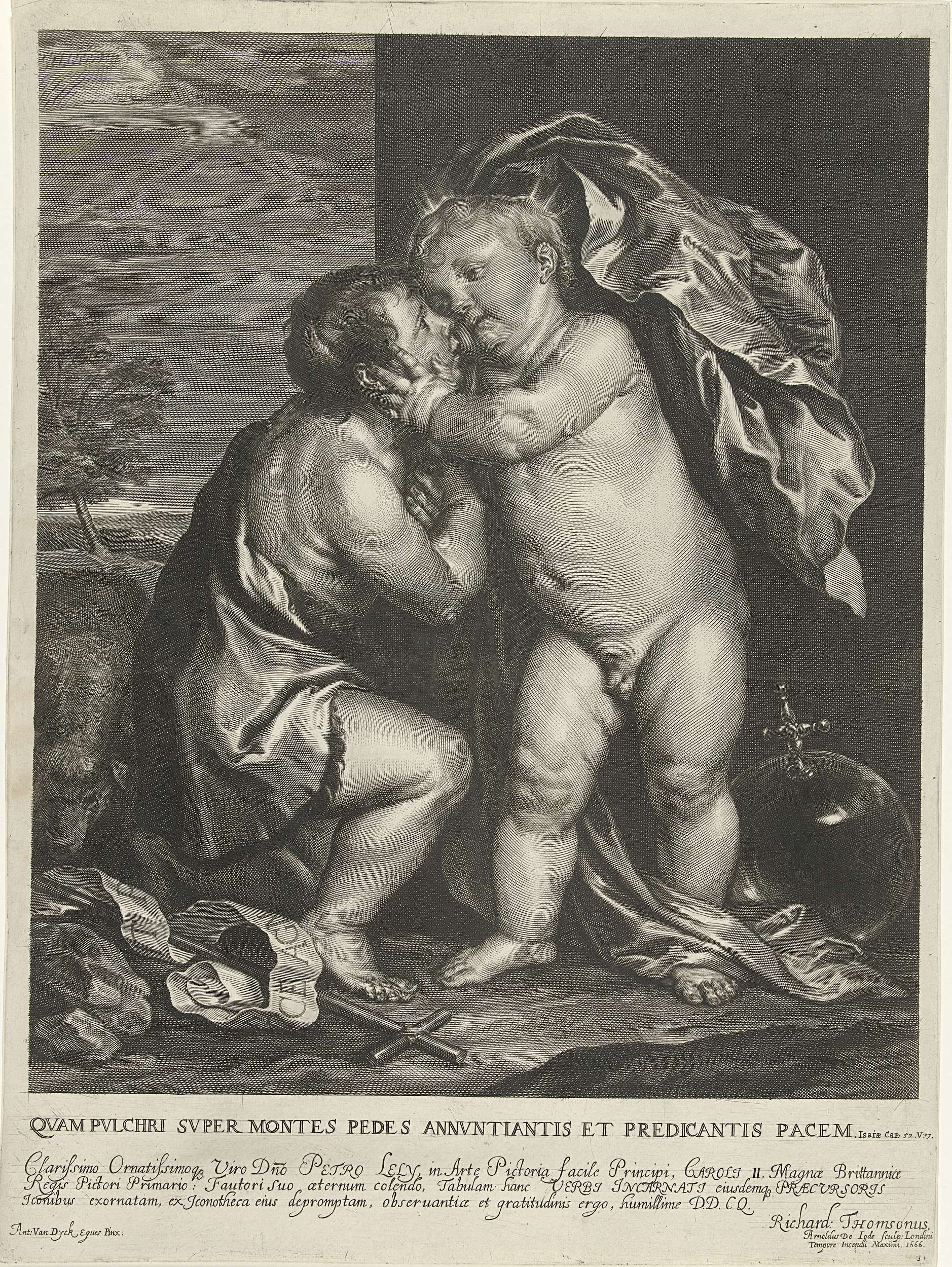 Het naakte Christuskind omhelst de jonge Johannes de Doper. Achter het Christuskind ligt een rijksappel en achter Johannes de Doper staat een lam. In de marge een Bijbelcitaat uit Jes. 57:7 en een drieregelige tekst in het Latijn.