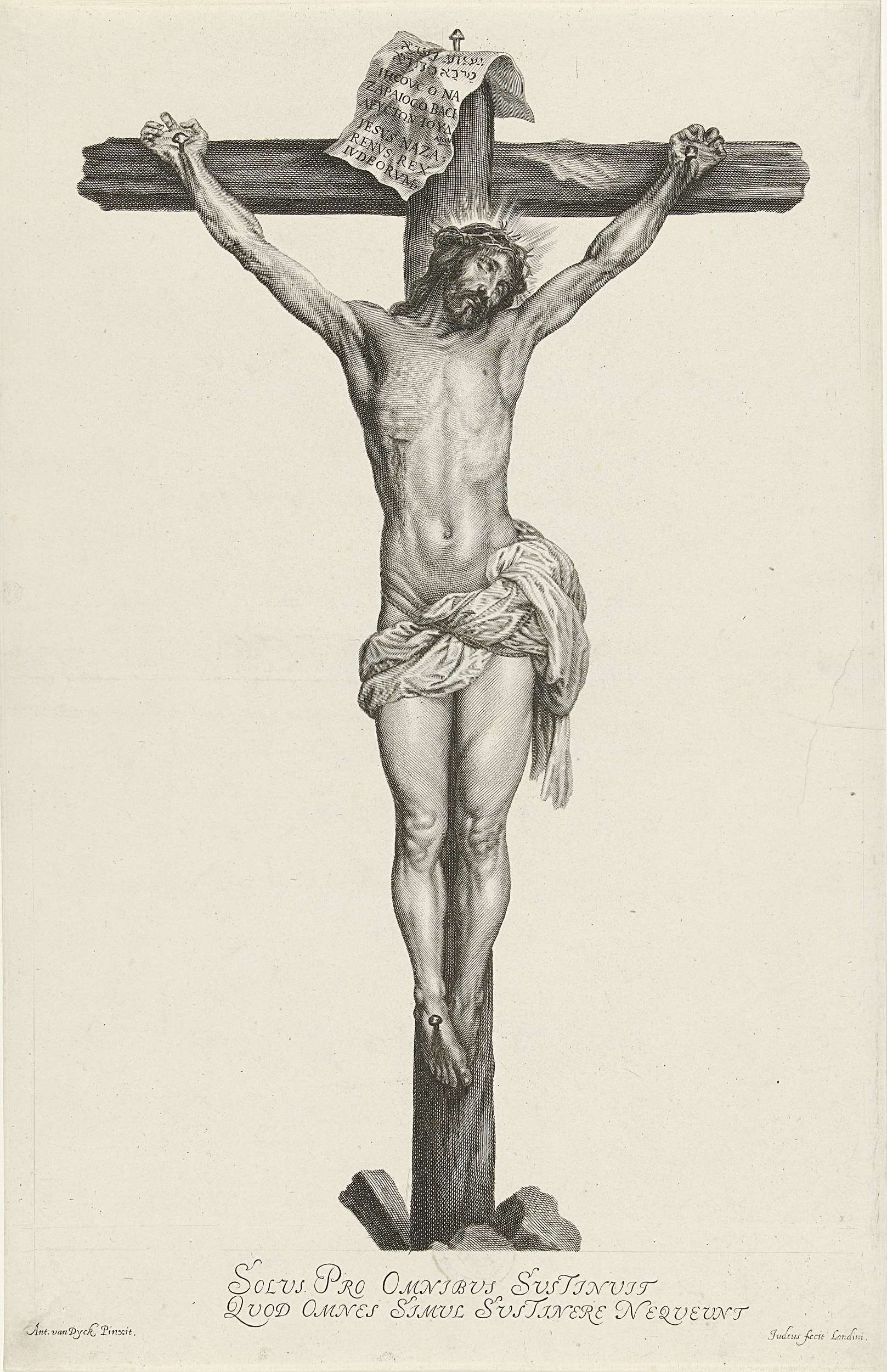 Christus aan het kruis. Aan het kruis is een papier met een opschrift genageld: 'Jezus van Nazareth, koning van de Joden' in het Hebreeuws, het Grieks en het Latijn. Onder de voorstelling een tweeregelig onderschrift in het Latijn.
