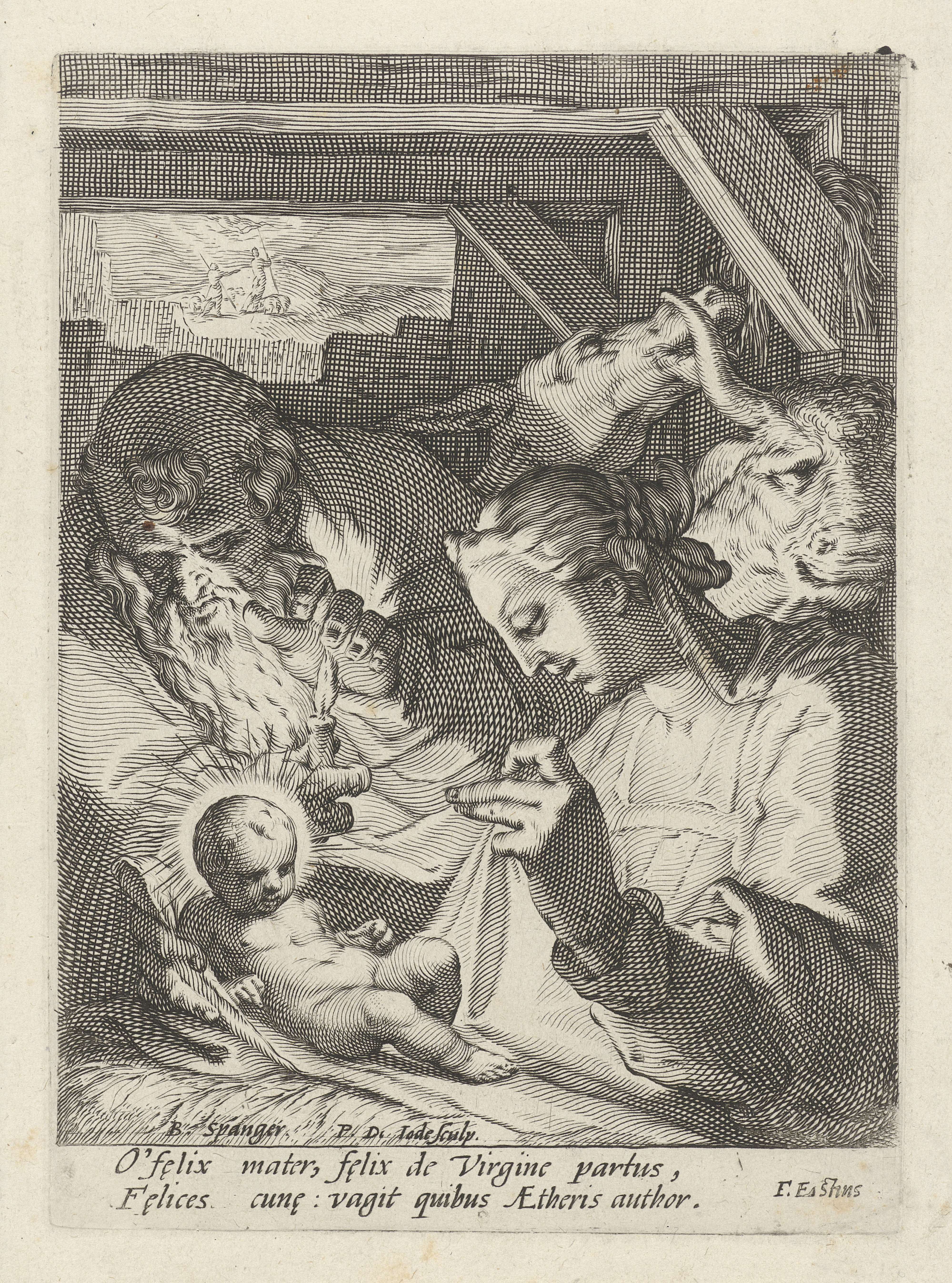Stal met Maria en Jozef bij het Christuskind, liggend op een doek. Jozef houdt een kaars vast. Achter hen de os en de ezel. Op de achtergrond twee herders. In de marge een tweeregelig onderschrift in het Latijn.