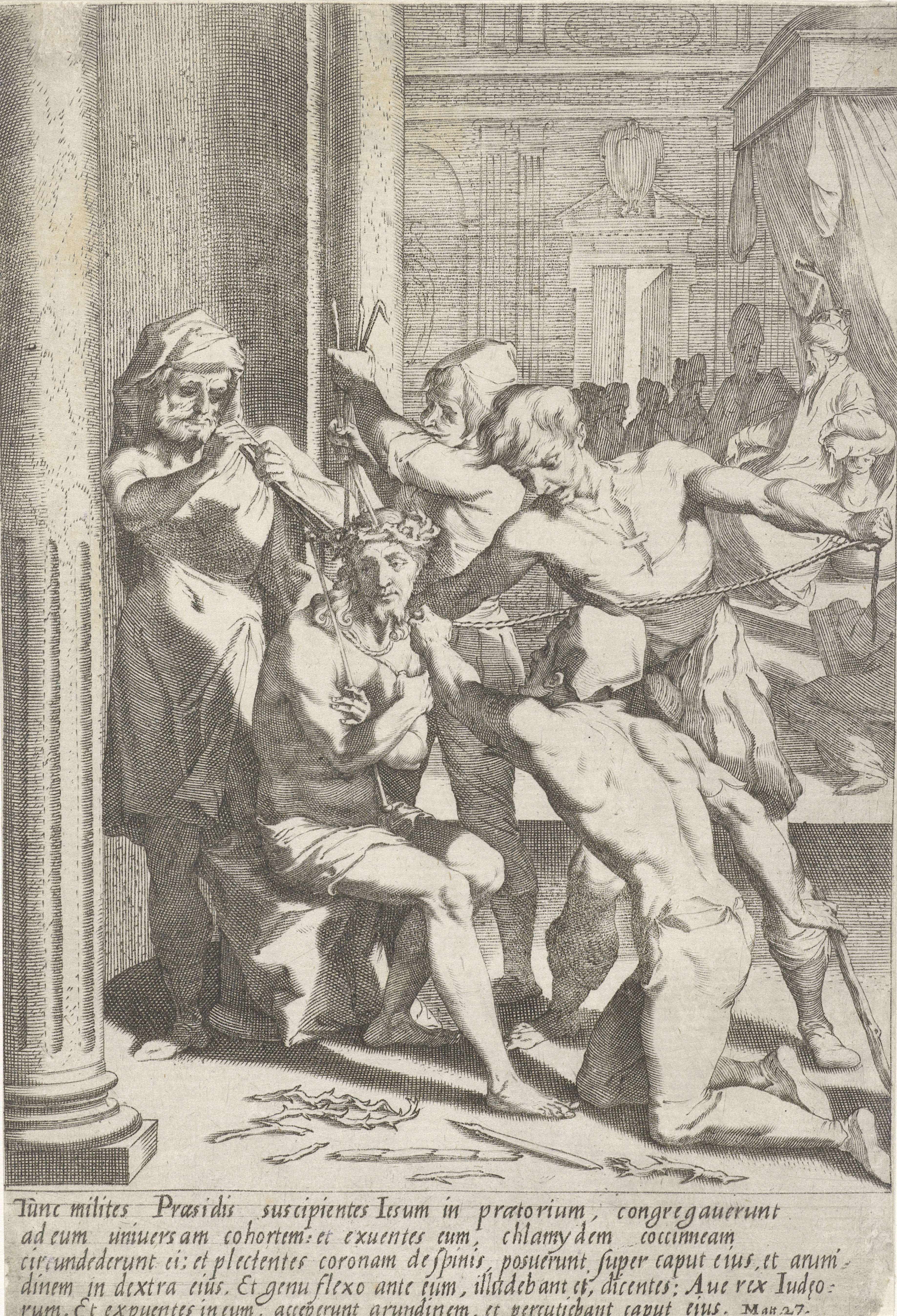 Christus, op lendendoek na naakt en zittend, wordt door twee soldaten met touwen geboeid. Een derde soldaat staat op het punt om Christus met een vuist in het gezicht te slaan. Een vierde soldaat duwt met twee stokken de doornenkroon op het hoofd van Christus. Op de voorgrond liggen doornen. In de marge een vijfregelig ...