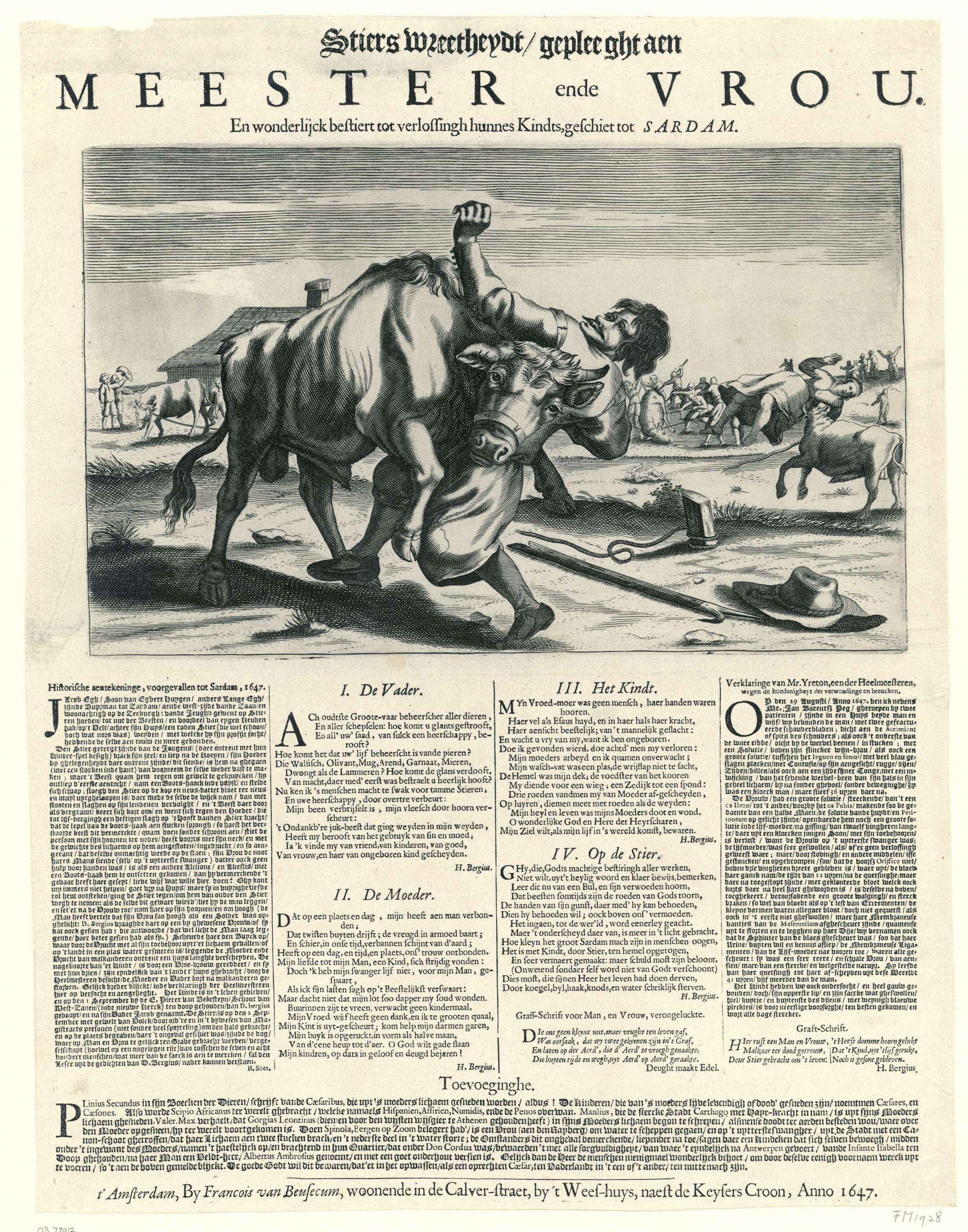 Illustratie van de gebeurtenissen die bekend staan als de wreedheid van de stier, 1647. De boer en zijn zwangere echtgenote die op 29 augustus 1647 te Zaandam door een stier werden aangevallen. De prent toont op de voorgrond hoe de man door de stier wordt aangevallen. Rechts is te zien hoe de vrouw op de ...