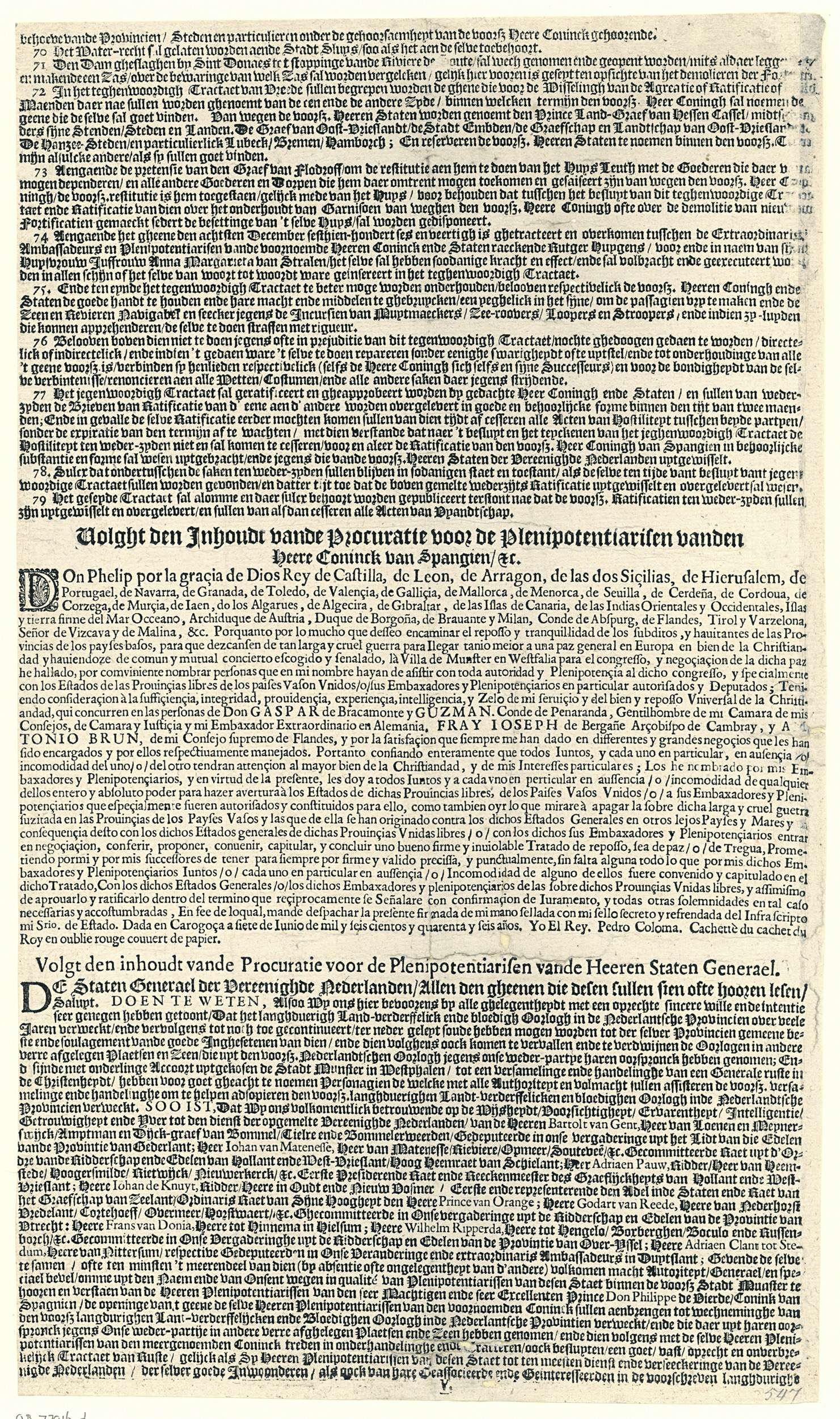 Het traktaat van de Vrede van Munster in 1648; het vijfde blad met de artikelen 70-79 en de inhoud van de procuraties voor de afgezanten van de koning van Spanje en van de Staten-Generaal. Tekst in één kolom in het Nederlands.