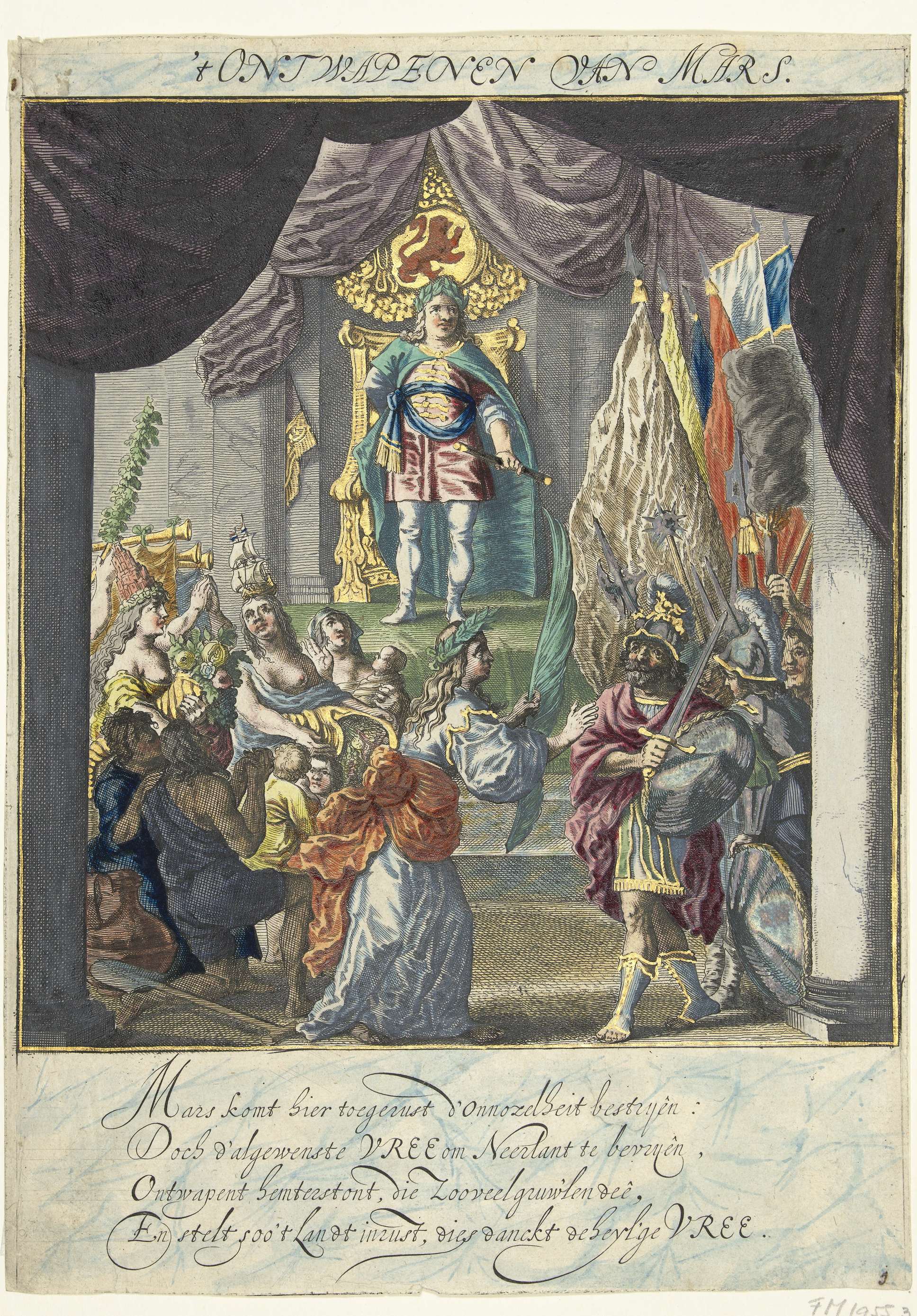 Vertoning van het Ontwapenen van Mars. Onderdeel van de vertoningen opgevoerd op 23 juni 1648 op de Schouwburg te Amsterdam naar aanleiding van het sluiten van de Vrede van Munster. De derde voorstelling toont hoe Mars door de Vrede wordt ontwapend. Op de achtergrond kijkt een Hollandse vorst toe. In het onderschrift een vers van ...