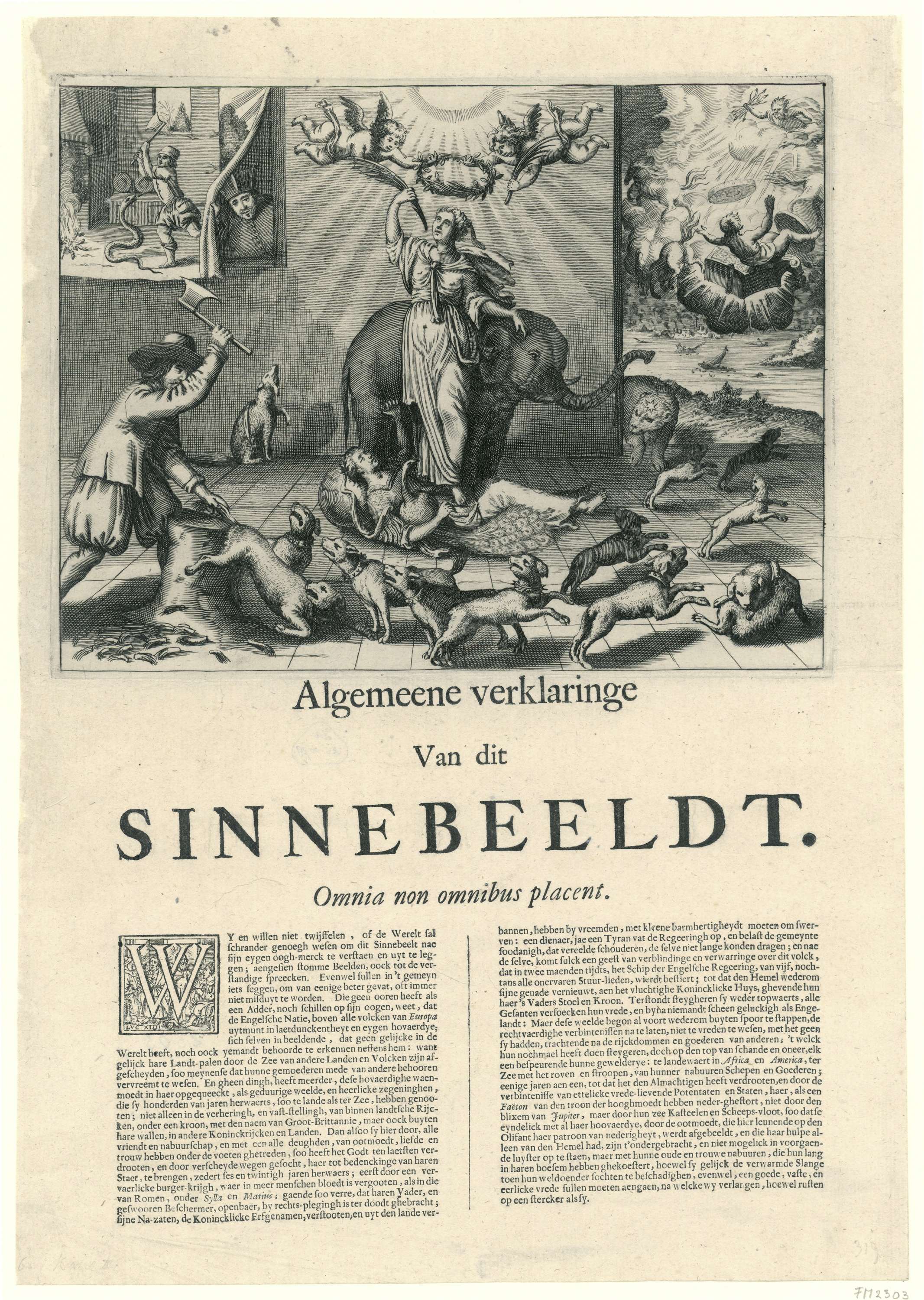 Zinnebeeld op de ondankbaarheid van de Engelsen aan de vooravond van de Derde Engelse Oorlog. Allegorische voorstelling met de Nederlandse Maagd en een Hollandse matroos die de staarten van de Engelse doggen afhakken. Onder de voorstelling de 'Algemeene verklaringe van dit Sinnebeeldt. Omnia non omnibus placent.' De prent is gekopieerd en opgenomen in 'A Justification ...