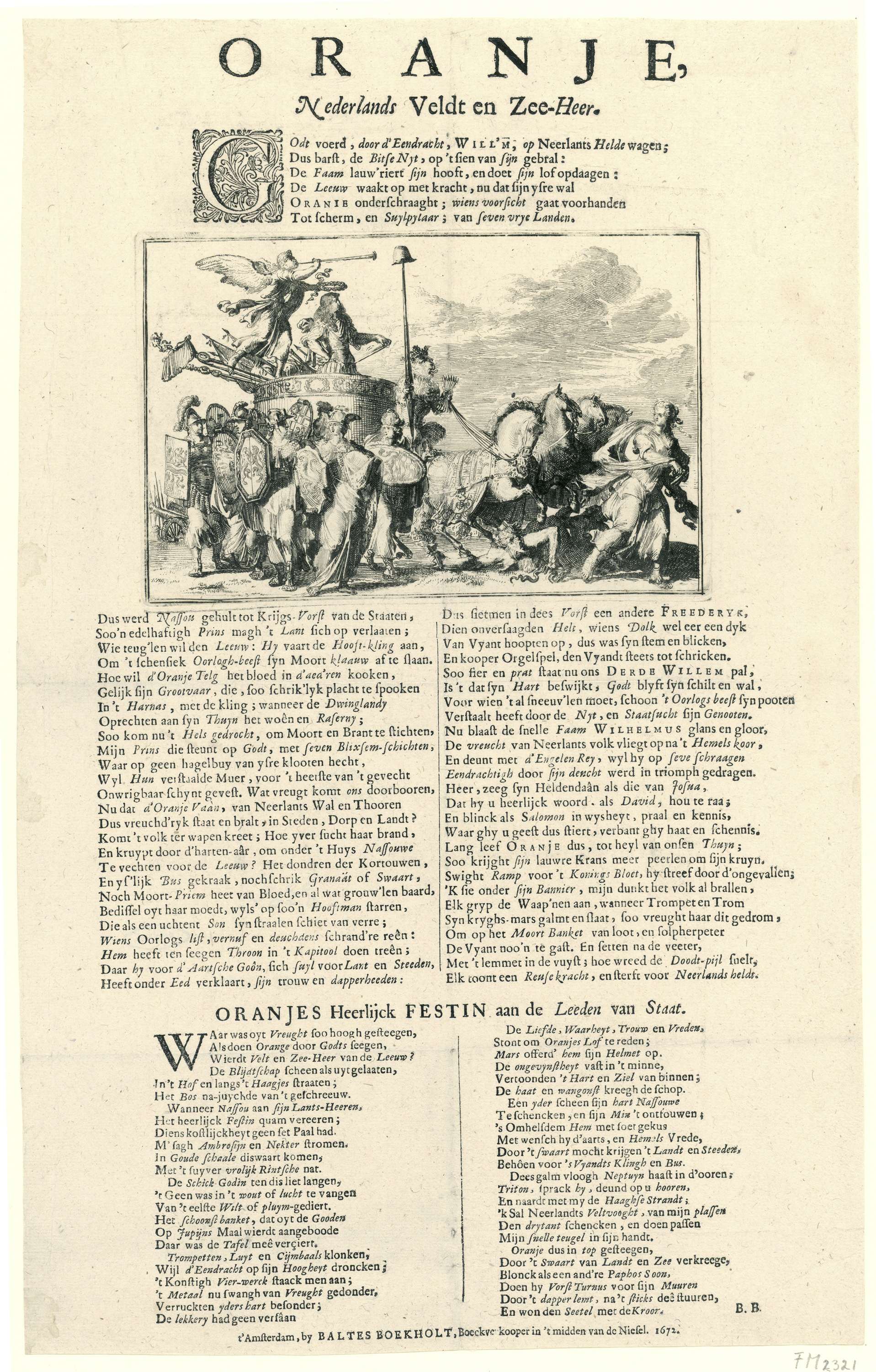 Blad met een voorstelling en gedichten ter ere van de benoeming van Willem III tot kapitein-generaal, 25 februari 1672. De prent toont de aankomst van de triomfwagen van Willem III. De Nederlandse leeuw voert de wagen. De Nijd wordt door de paarden vertrapt. Personificaties van de zeven provincies kijken toe. Boven en onder de plaat ...