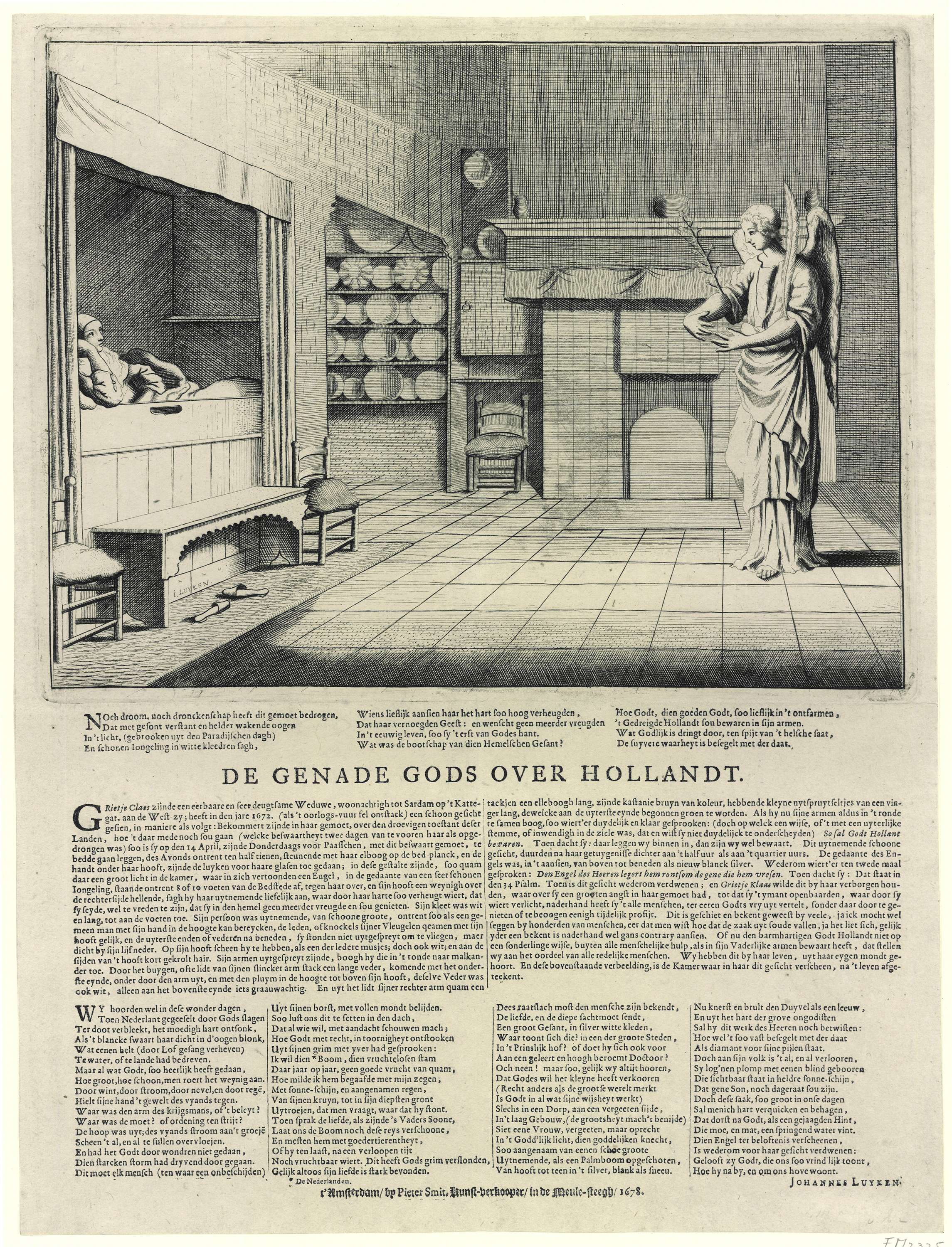 De verschijning van een engel aan Grietje Claes (of Klaas), een deugdzame weduwe wonend te Zaandam, op 14 april 1672. De voorstelling toont een interieur met de verschijning van de engel aan de vrouw die in haar bedstee ligt. De engel verzekert de vrouw dat God Nederland wel zal bewaren. Onder de voorstelling een beschrijving ...