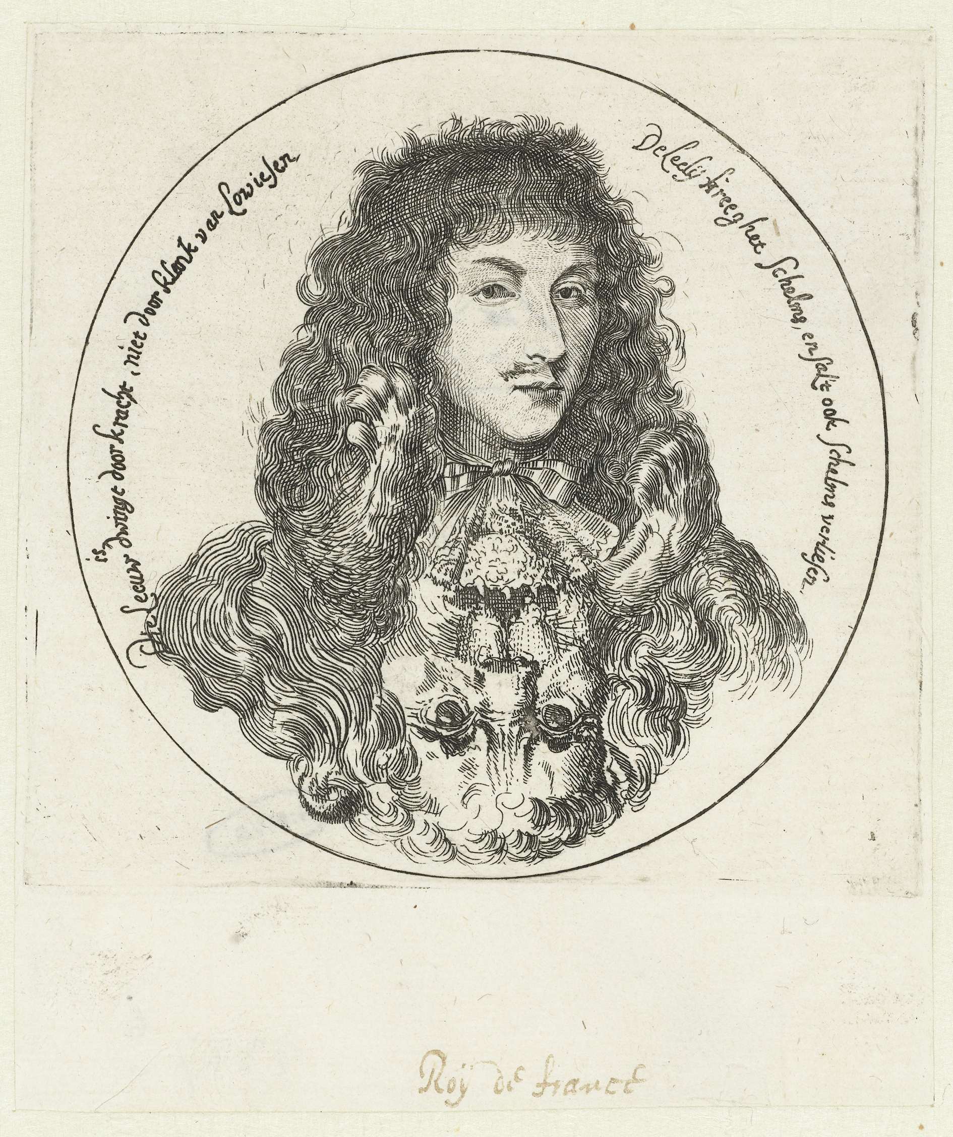 In het Rampjaar 1672 werd de Republiek gelijktijdig door Frankrijk, Engeland en Duitsland aangevallen. Dit zijn dubbelkoppen van de hoofdrolspelers die bij omkering hun ware aard onthullen. Van links naar rechts: stadhouder Willem III als Mars, Lodewijk XIV als een leeuw, de Engelse koning Karel II als een tijger, aartsbisschop Maximiliaan Hendrik van Beieren als ...