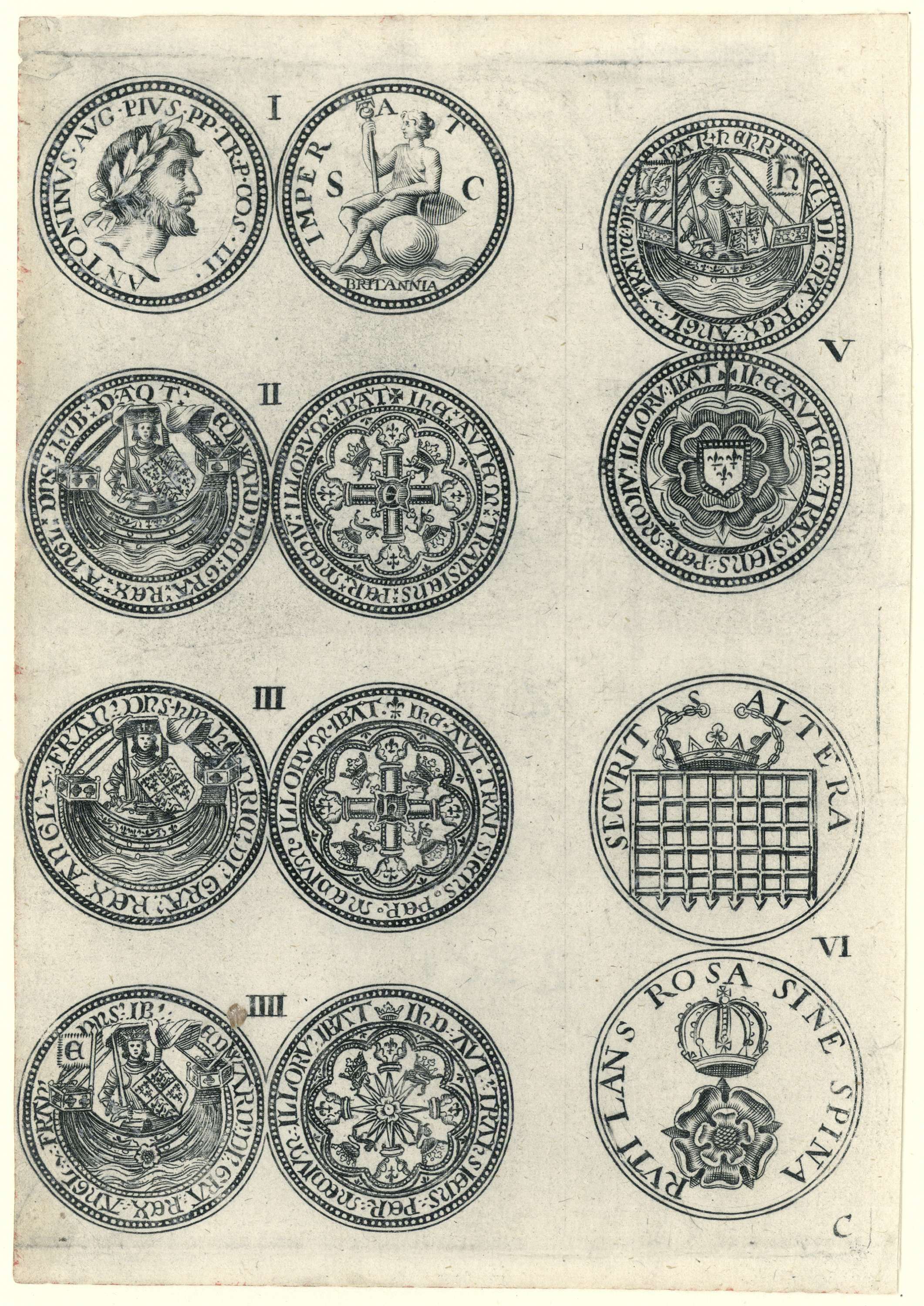 Illustratie gemerkt 'C', afkomstig uit W. Stubbe, 'A Further Justification of the Present War against the United Netherlands', Londen 1673. De voorstelling toont de voor- en keerzijden van zes oude Engelse munten, als bewijs voor de Engelse heerschappij op de wereldzeeën. De prenten zijn door de Engelsen gebruikt als propaganda om de oorlog tegen de ...