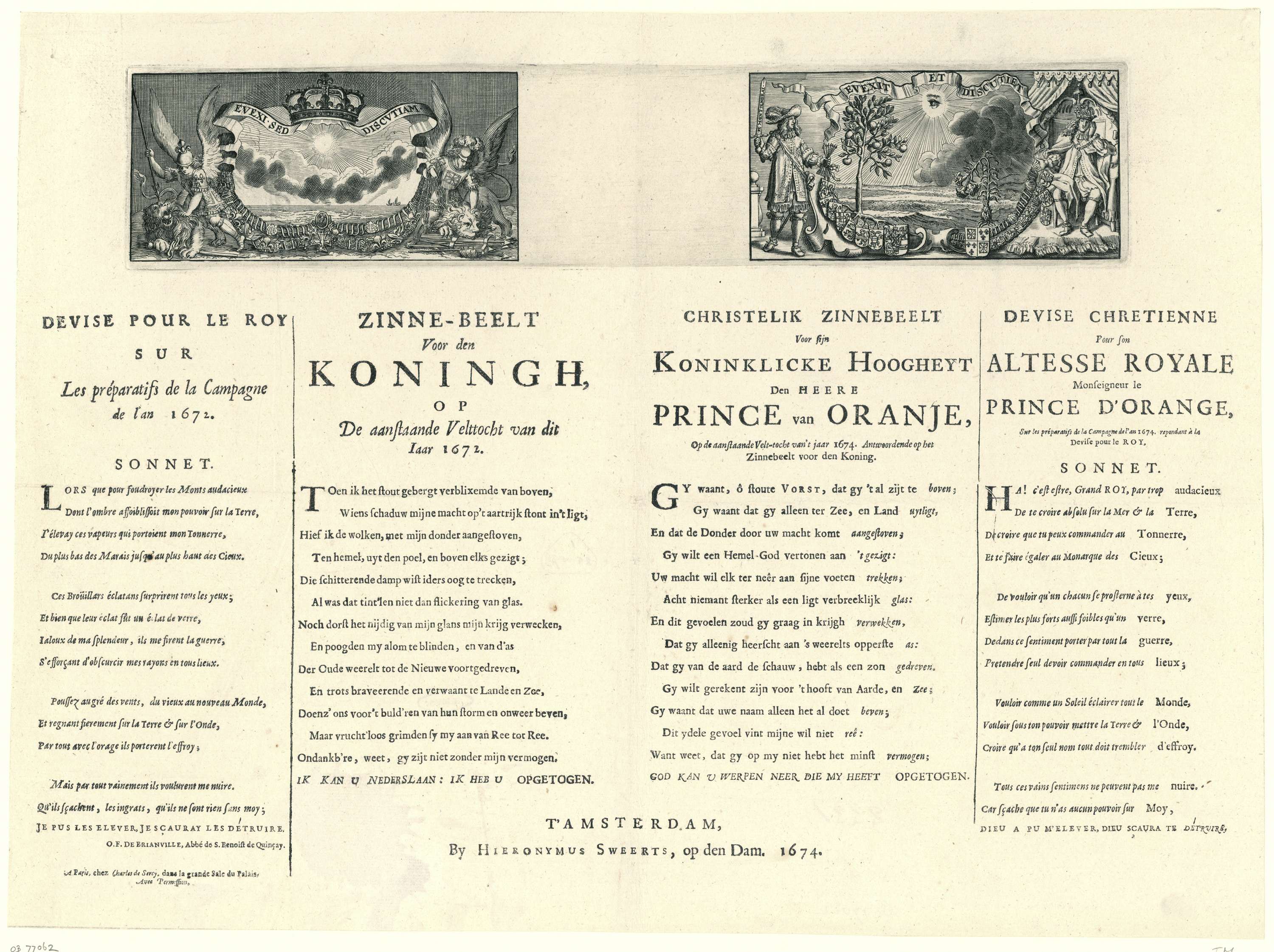 Blad met links een Franse zinnebeeld met de Franse koning, waarin hij zich vergelijkt met de zon en waarin de Nederlandse Leeuw overwonnen wordt, met begeleidende verzen vervaardigd ter gelegenheid van de Franse campagne in 1672. Rechts een Nederlandse zinnebeeld met de strijdvaardige prins Willem III staande naast de Oranjeboom en een melancholieke Lodewijk XIV ...