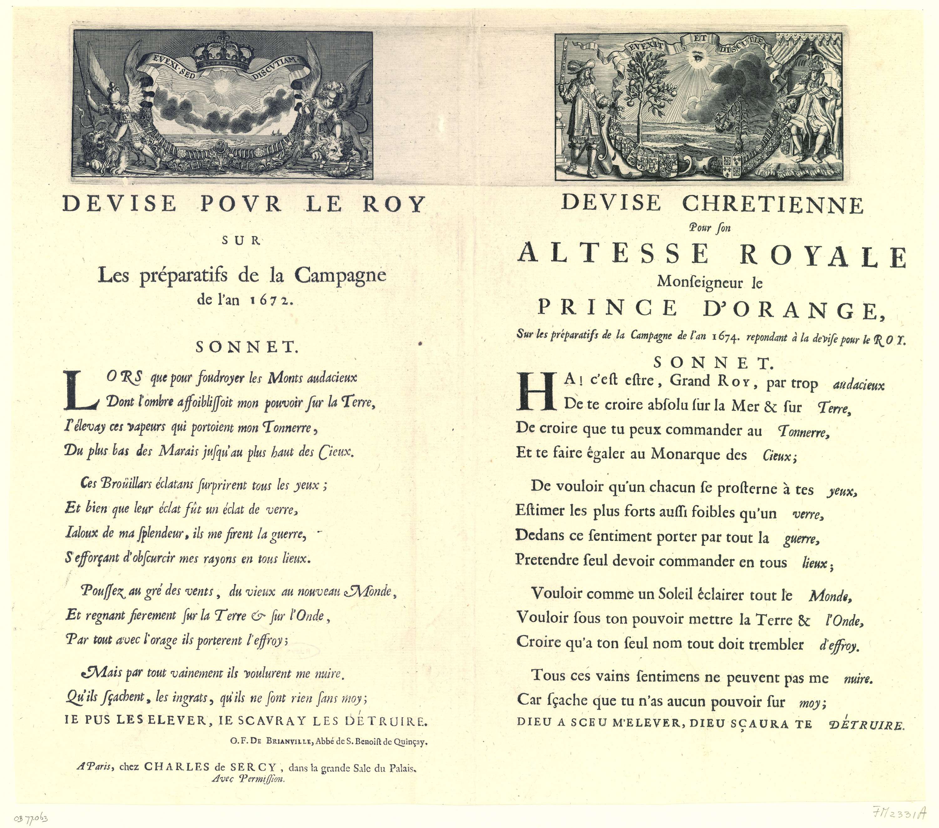 Blad met links een Franse zinnebeeld met de Franse koning, waarin hij zich vergelijkt met de zon en waarin de Nederlandse Leeuw overwonnen wordt, met begeleidende verzen vervaardigd ter gelegenheid van de Franse campagne in 1672. Rechts een Nederlandse zinnebeeld met de strijdvaardige prins Willem III en een melancholieke Lodewijk XIV zittend op zijn troon, ...